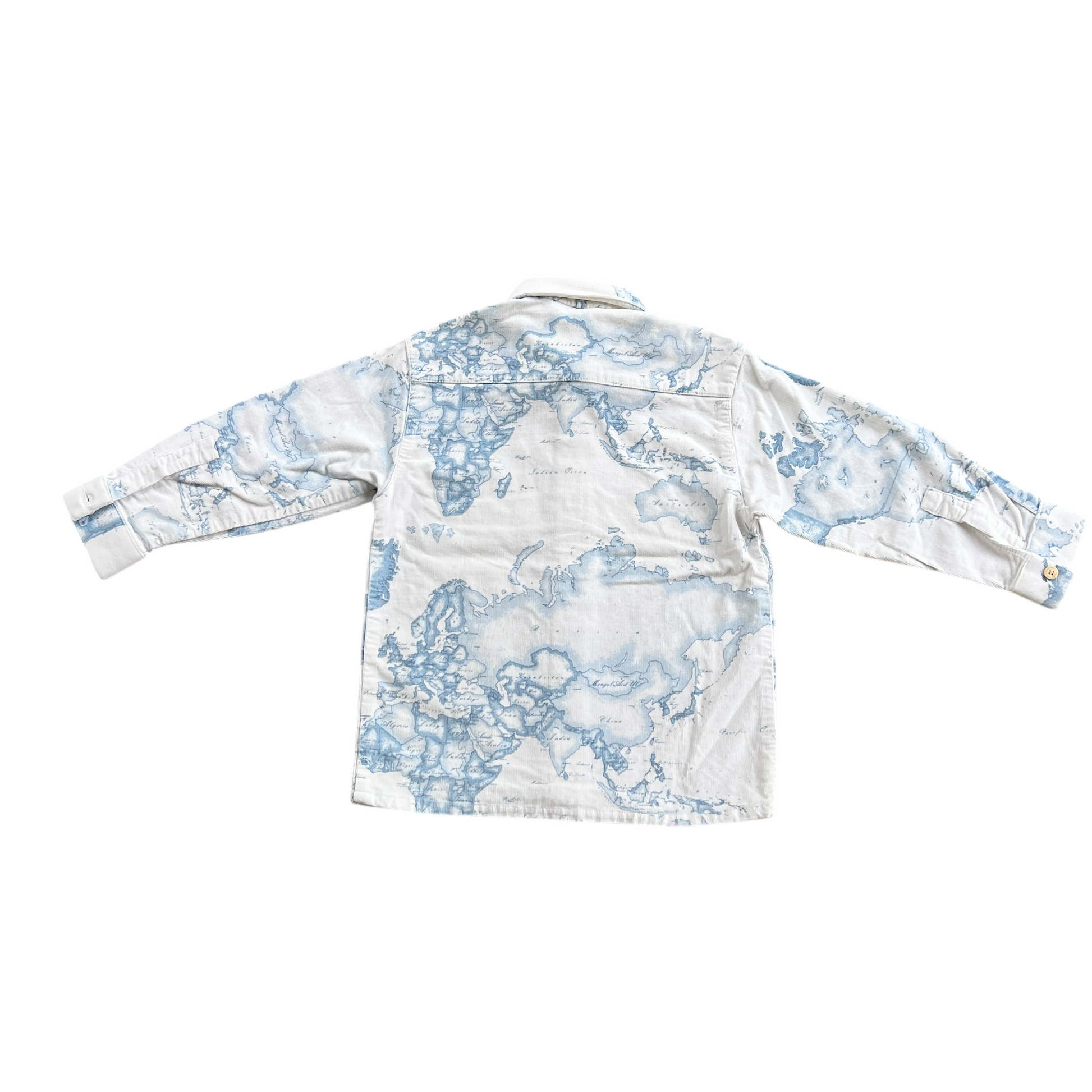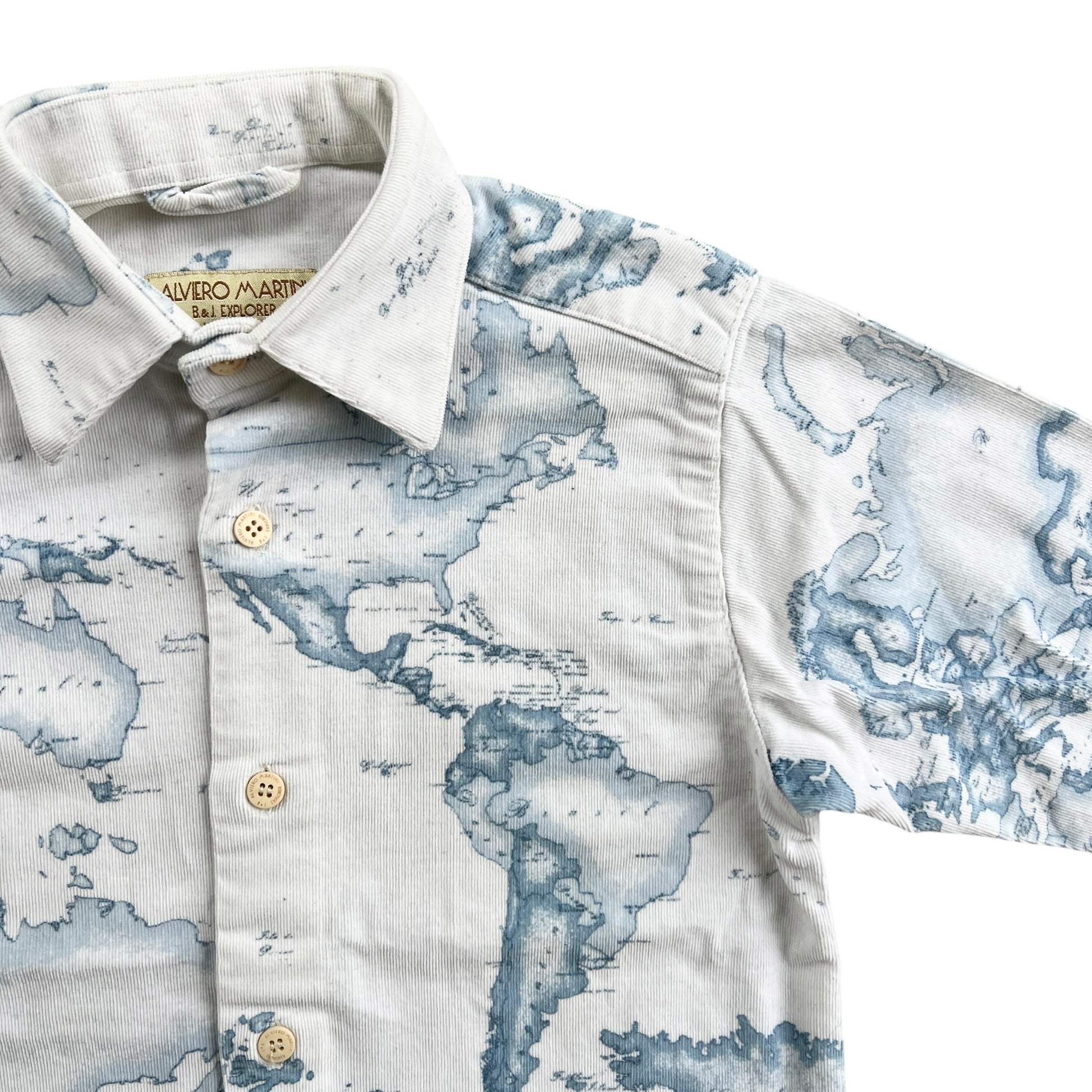 Camicia in microvelluto Alviero Martini per bambini di 4 anni, bianca con raffinati disegni della caratteristica cartina geografica del brand in tonalità blu. Un capo originale, perfetto per le giornate invernali, che unisce eleganza e unicità, tipiche dello stile Alviero Martini. Perfetta con un pantalone elegante per una cerimonia o con un jeans in una giornata più casual.