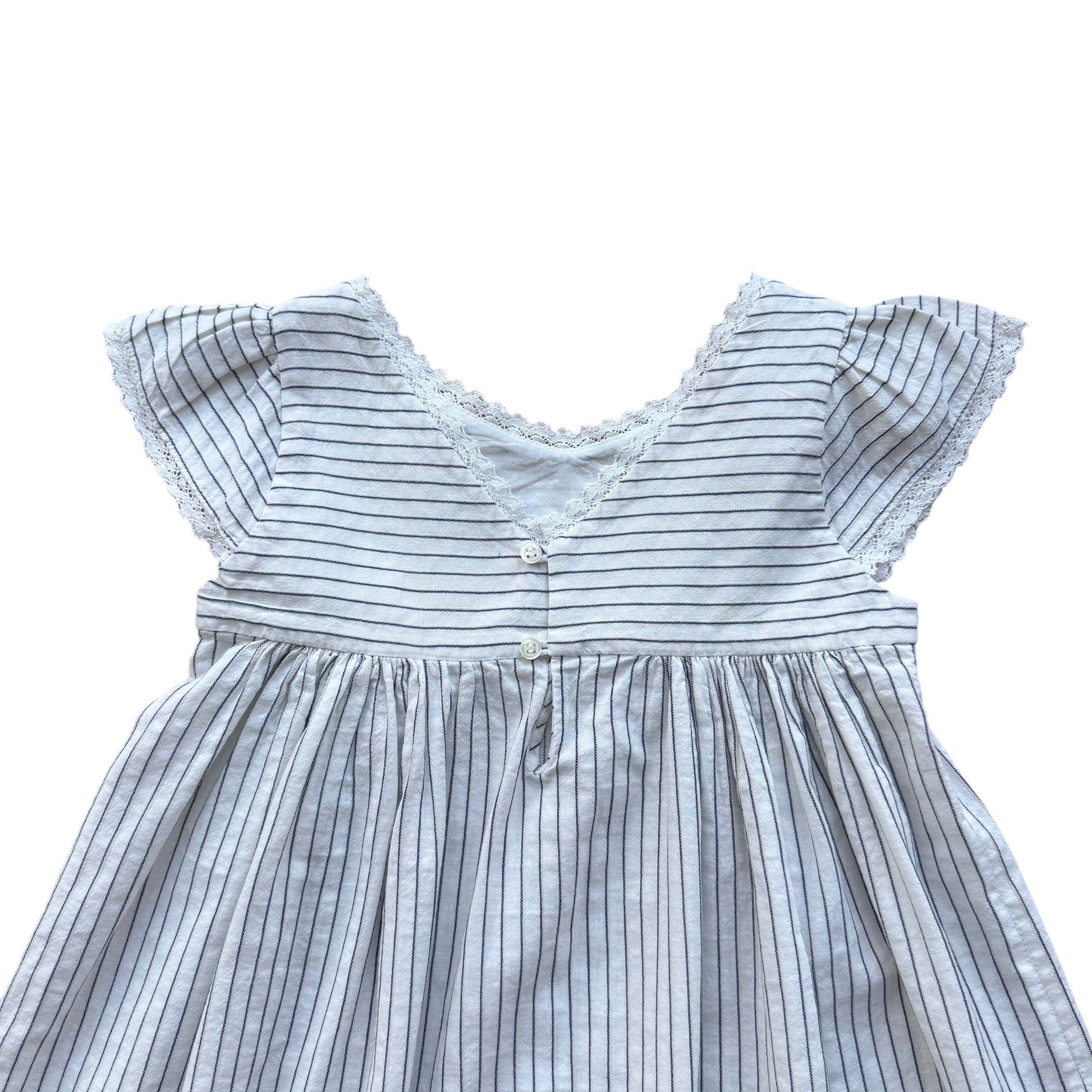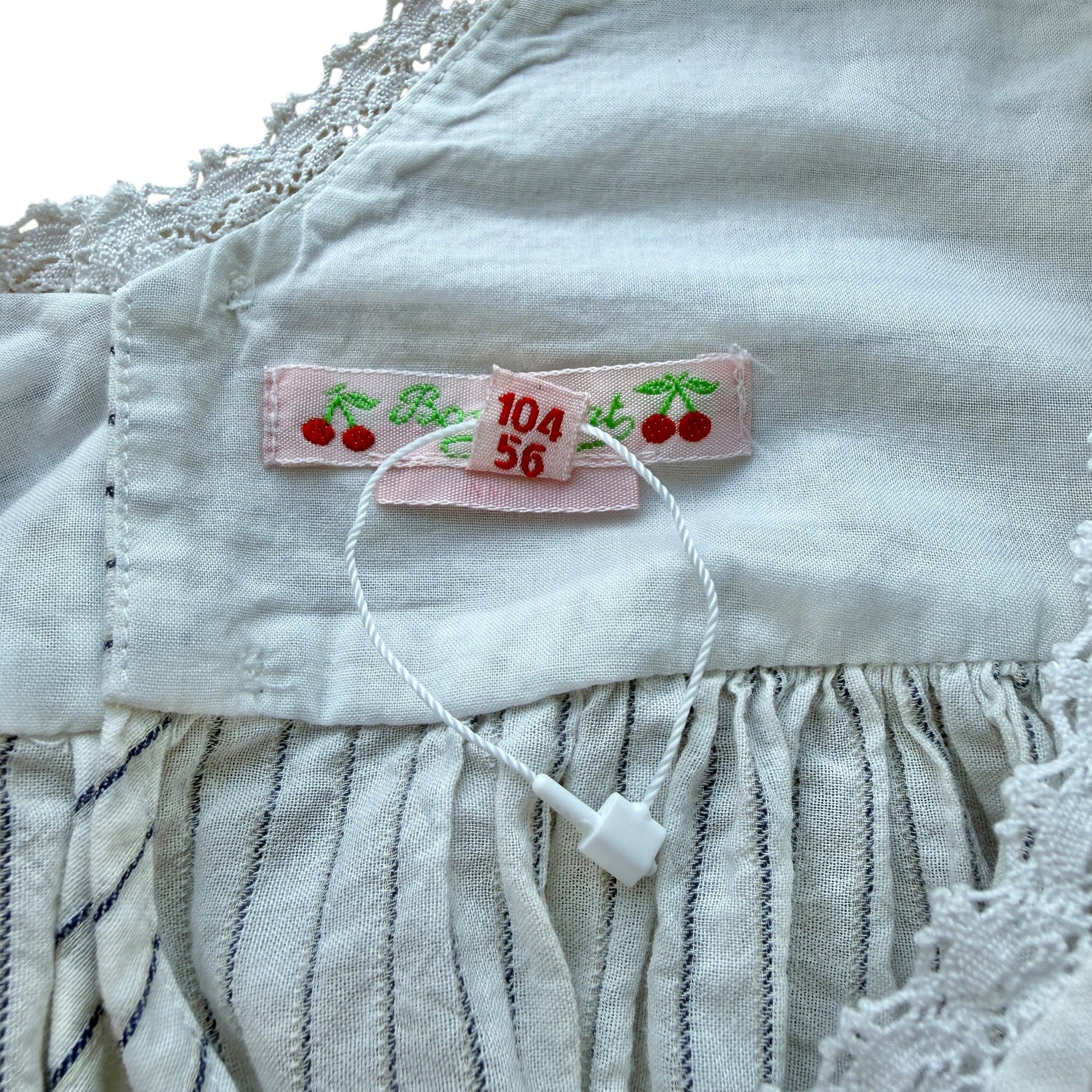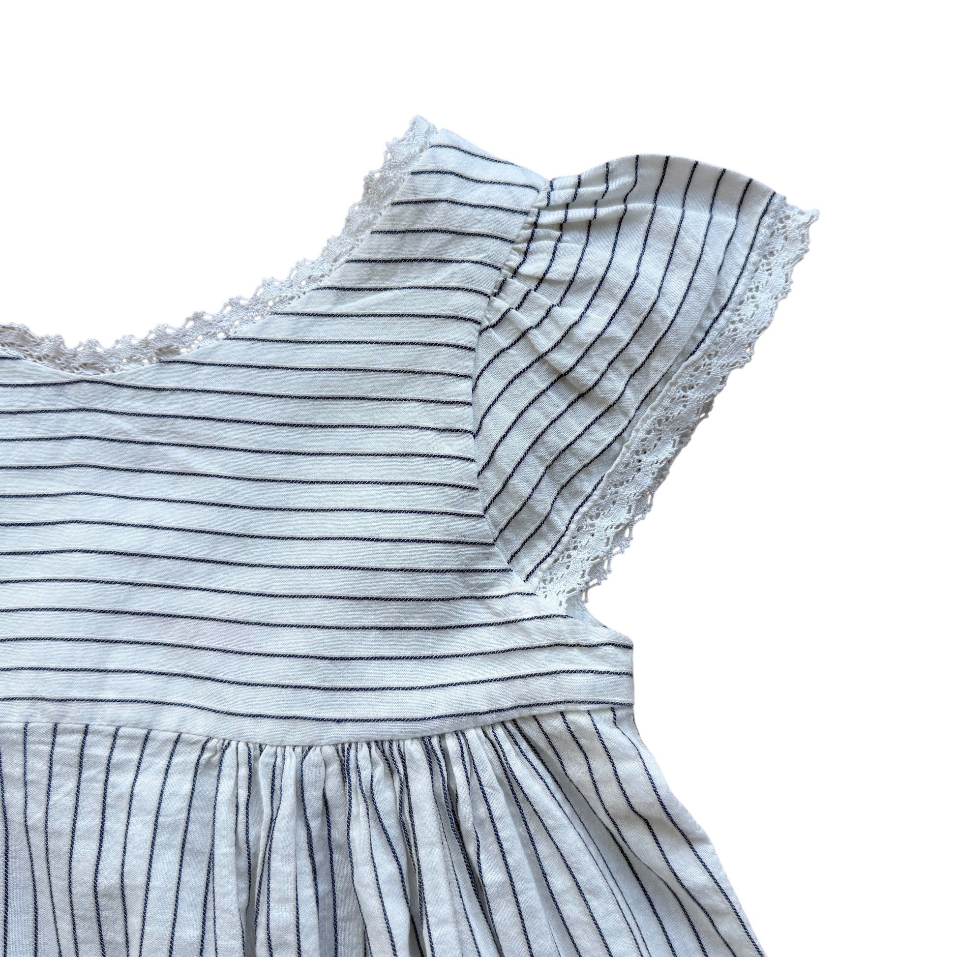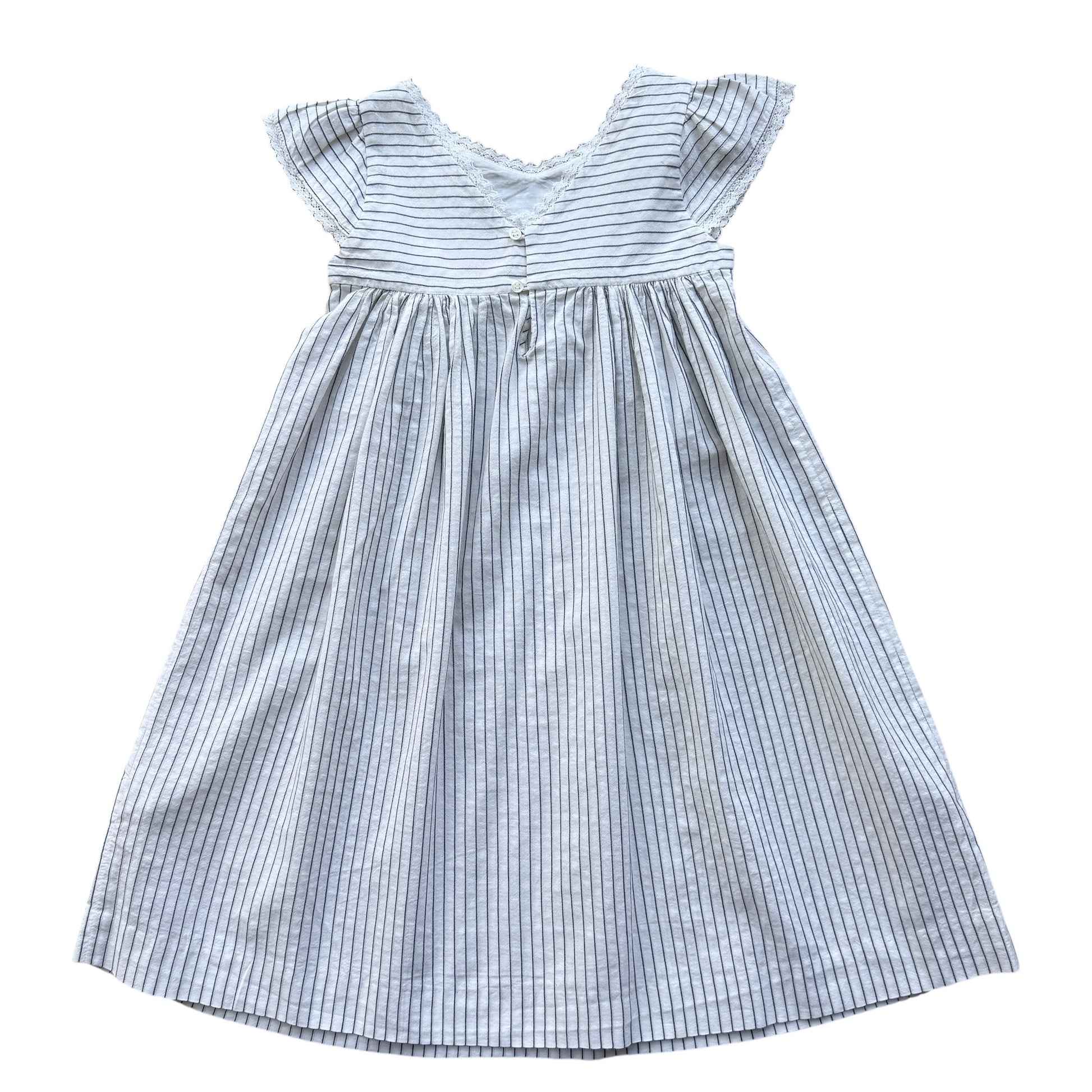 Abito estivo firmato Bonpoint, dallo stile fresco e raffinato. Realizzato in cotone leggero bianco con sottili righe verticali blu, presenta maniche corte con lieve arricciatura, scollatura delicata con bordo rifinito e linea morbida svasata che dona movimento. Un modello essenziale e senza tempo, perfetto per la stagione calda.