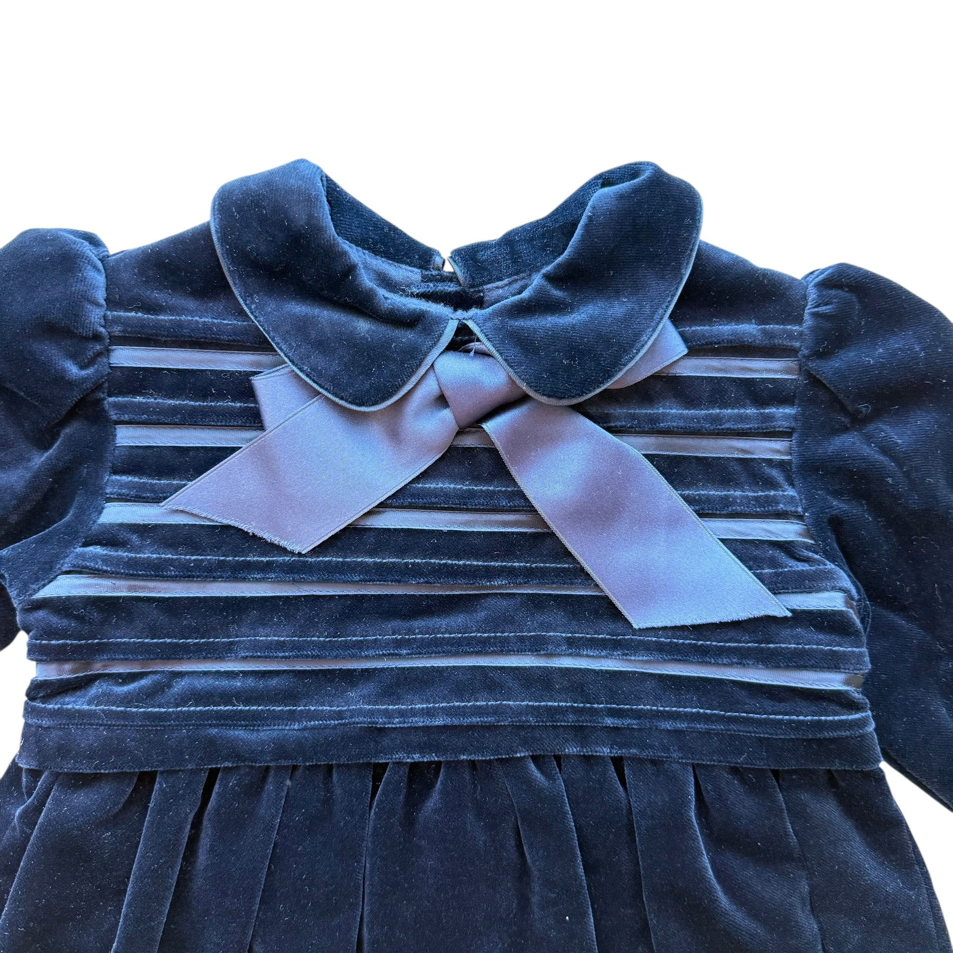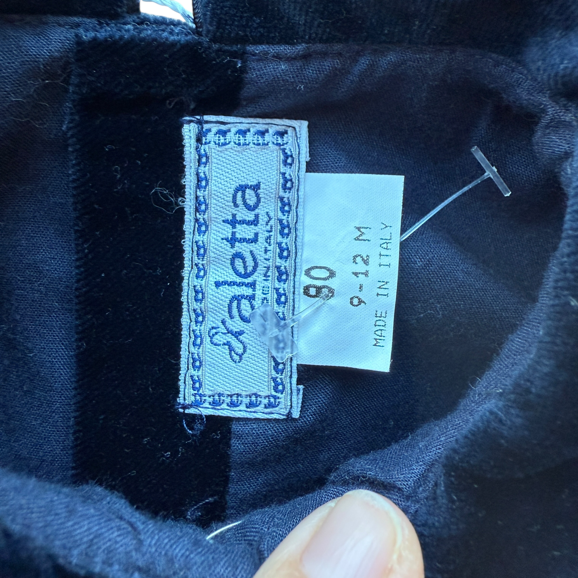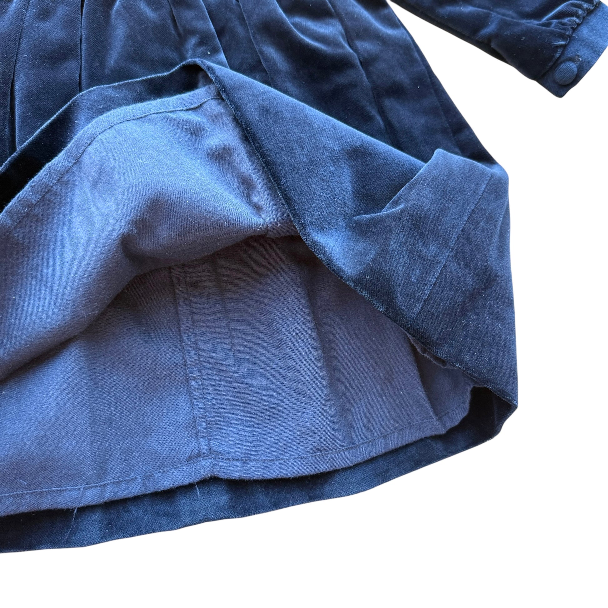 Elegante abito in morbido velluto blu notte firmato Aletta, con colletto rotondo, fiocco in raso e delicata lavorazione sul petto. A maniche lunghe e dal fascino rétro, è un capo raffinato e confortevole, perfetto per le occasioni speciali. Preloved di qualità eccellente e irresistibile dolcezza.