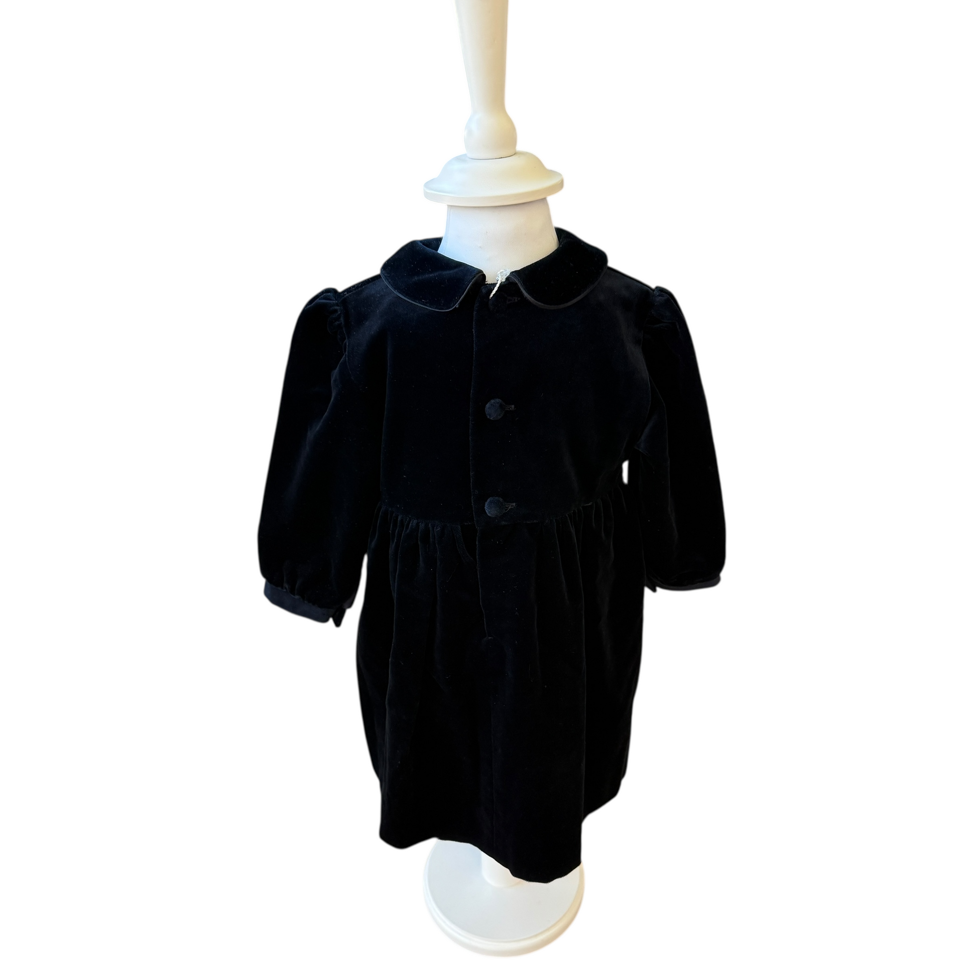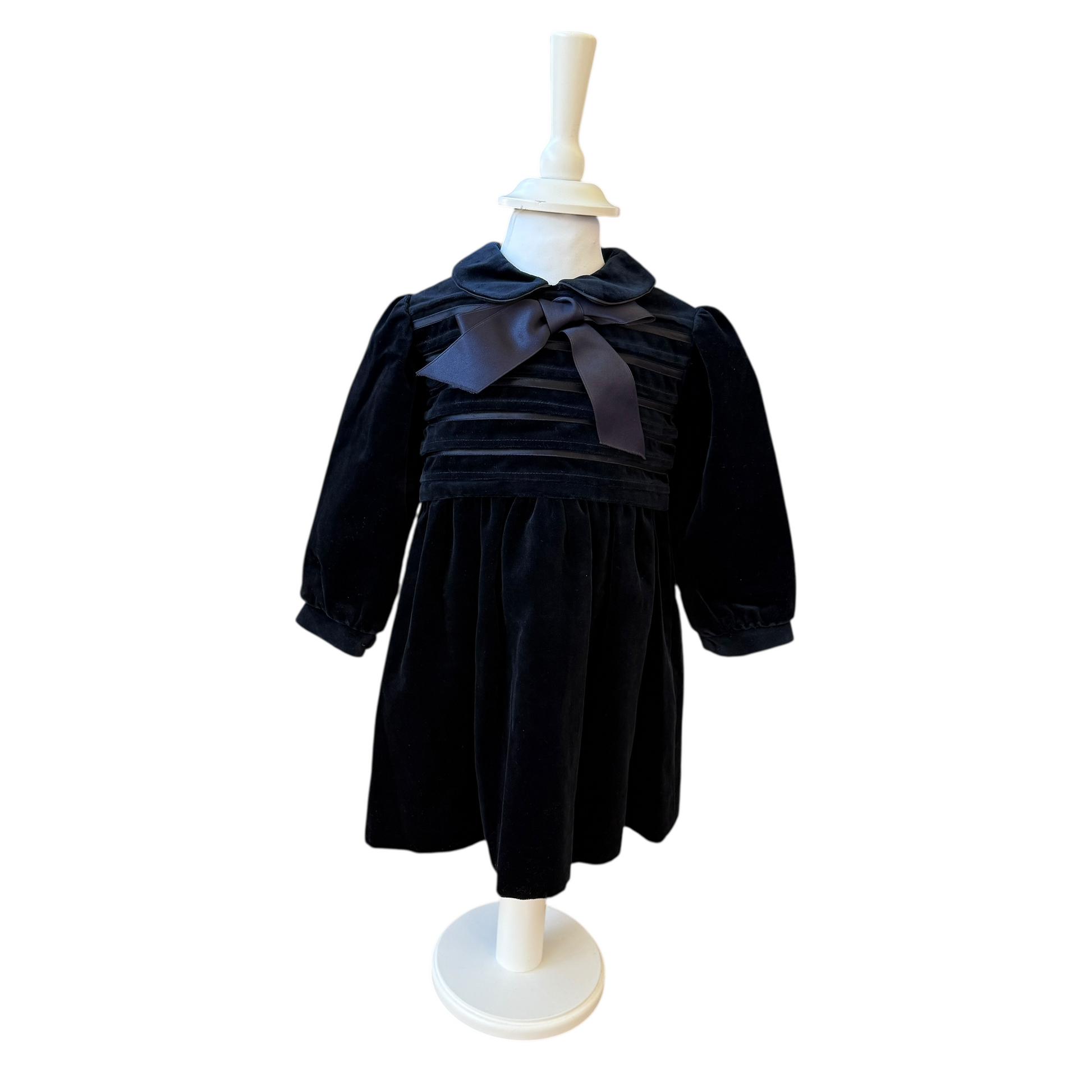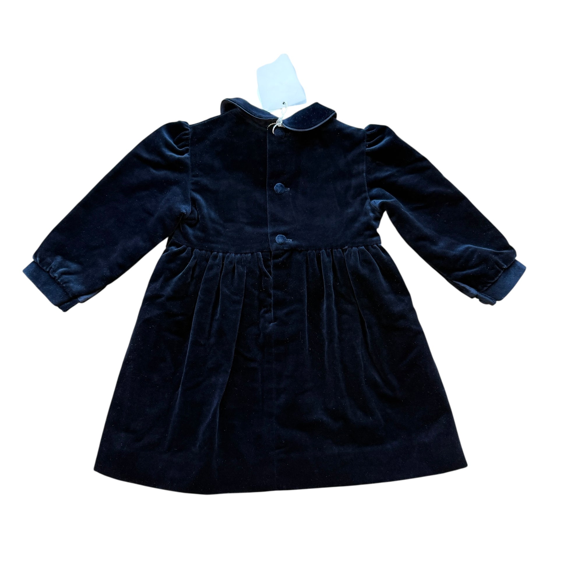 Elegante abito in morbido velluto blu notte firmato Aletta, con colletto rotondo, fiocco in raso e delicata lavorazione sul petto. A maniche lunghe e dal fascino rétro, è un capo raffinato e confortevole, perfetto per le occasioni speciali. Preloved di qualità eccellente e irresistibile dolcezza.