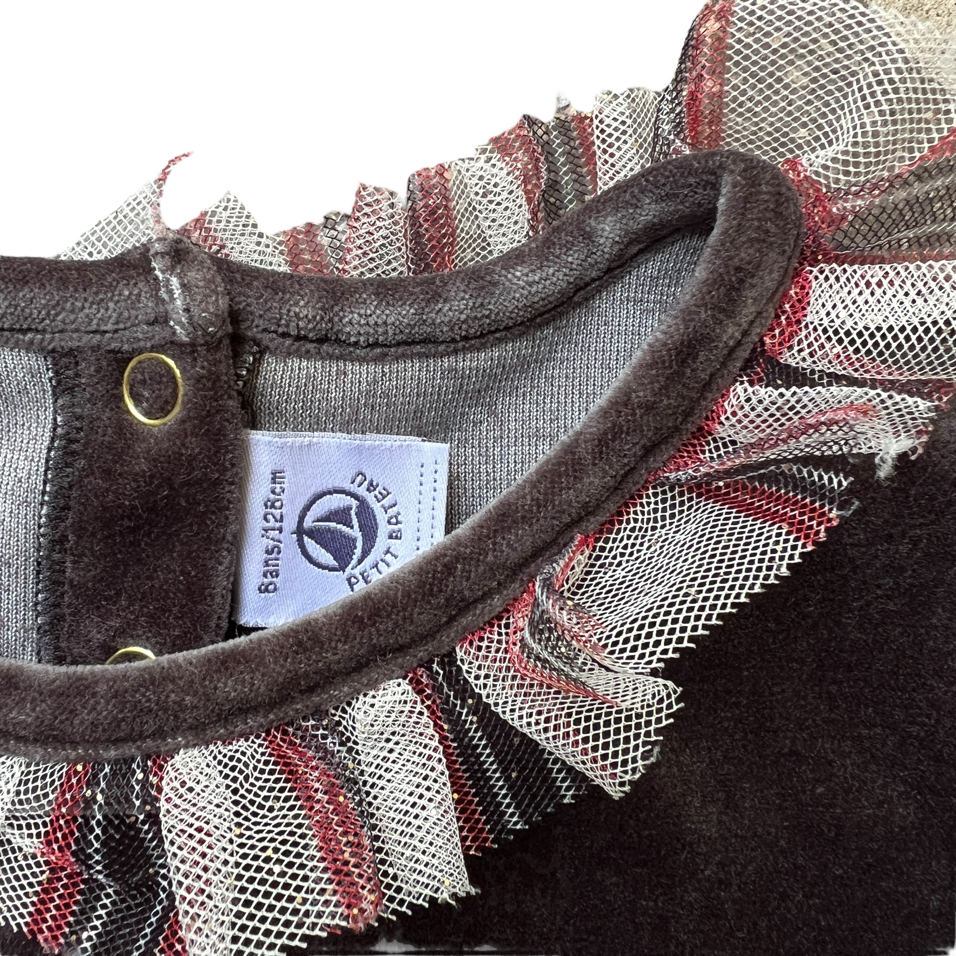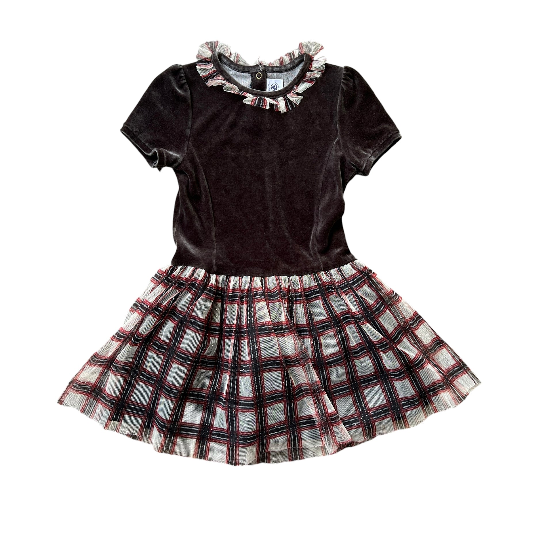 Elegante abito Petit Bateau per bambine di 6 anni, in morbido velluto grigio. La gonna e i dettagli intorno al collo sono impreziositi da raffinato tulle a quadri con glitter, per un tocco brillante e sofisticato. Ideale per occasioni speciali, combina comfort e stile in un design unico.