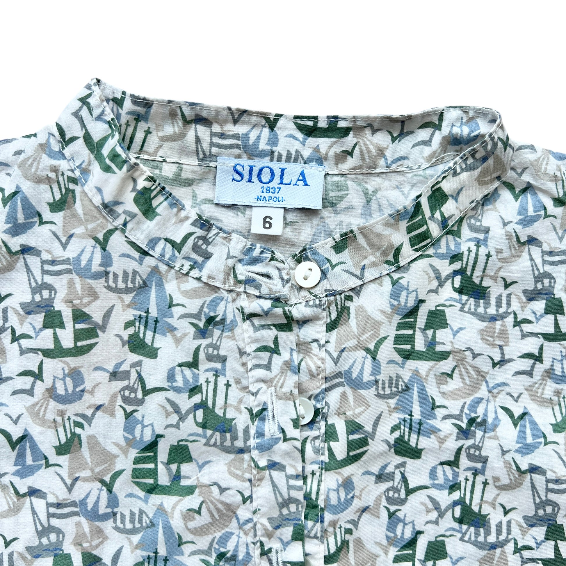 Camicia Siola per bambino di 6 anni, modello coreano in 100% cotone, con disegni di barche nei toni del verde, tortora e celeste. Maniche lunghe e bottoncini in madreperla per un tocco raffinato e senza tempo. Linea essenziale e tessuto fresco, ideale per cerimonie o look eleganti ma comodi. Qualità artigianale made in Italy.