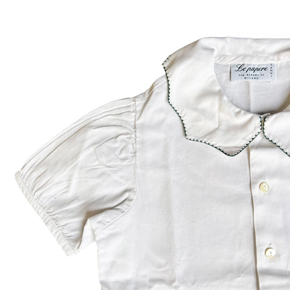 Camicia in cotone Le Papere manica corta a palloncino per bambine di 5 anni, con un delizioso colletto a punte e bordature verdi. Fresca e giocosa, è perfetta per un look estivo e allegro, ideale per le giornate di sole e di divertimento all'aria aperta.