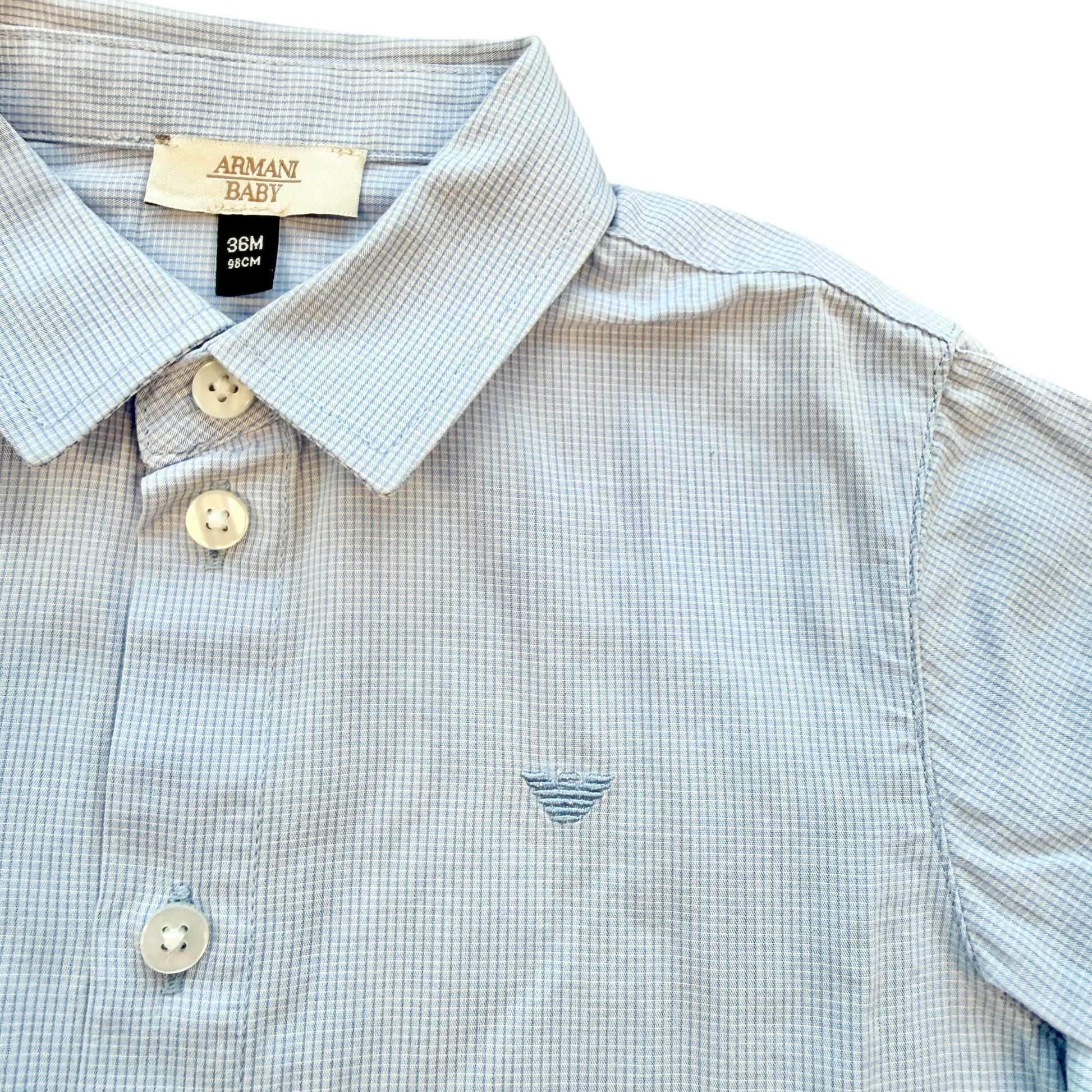 Camicia a micro quadretti azzurri Armani Baby, taglia 36 mesi. Modello elegante e raffinato, perfetto per occasioni speciali o per un look curato anche tutti i giorni. Tessuto leggero e confortevole, facile da abbinare. Capo usato in ottime condizioni, pezzo unico pronto alla spedizione.