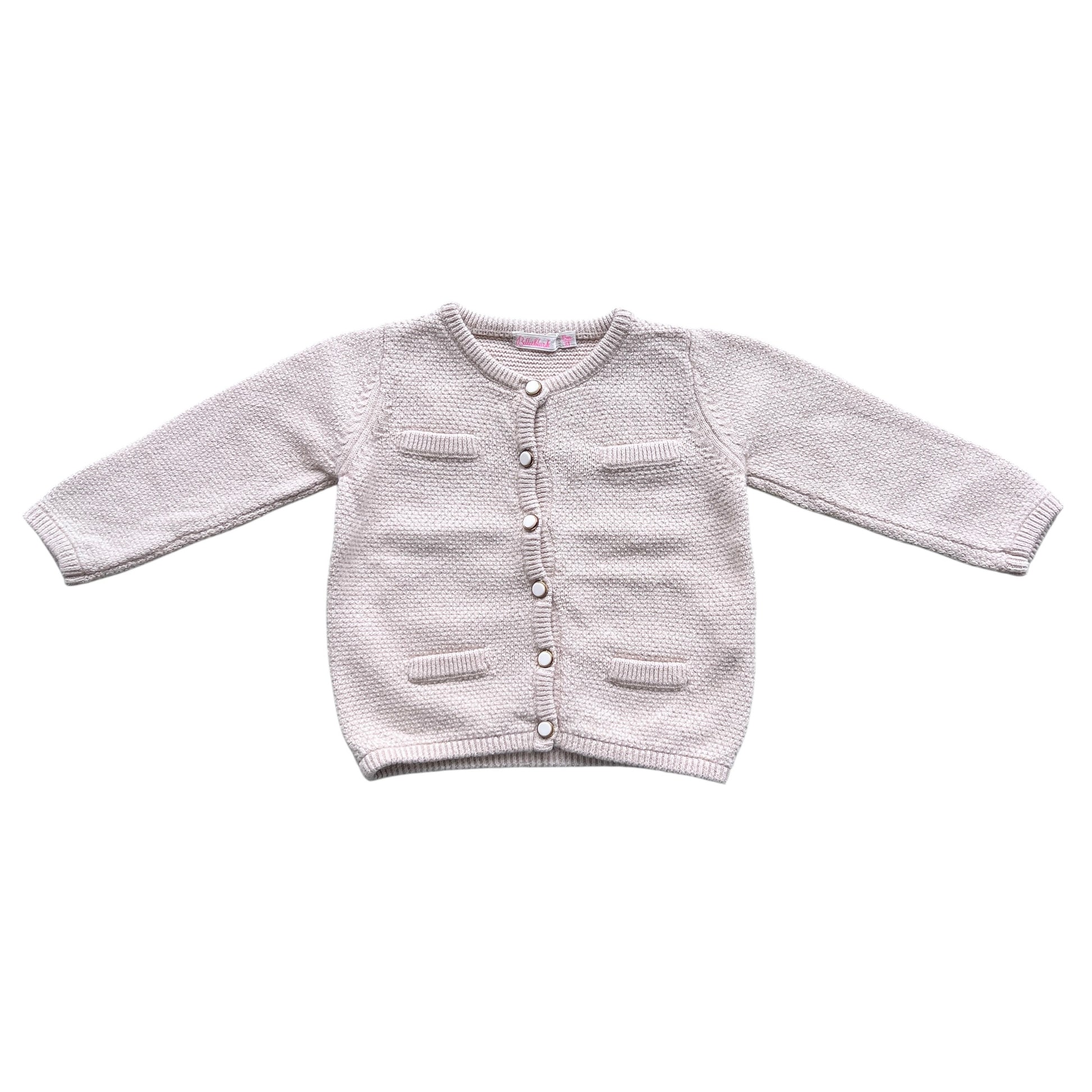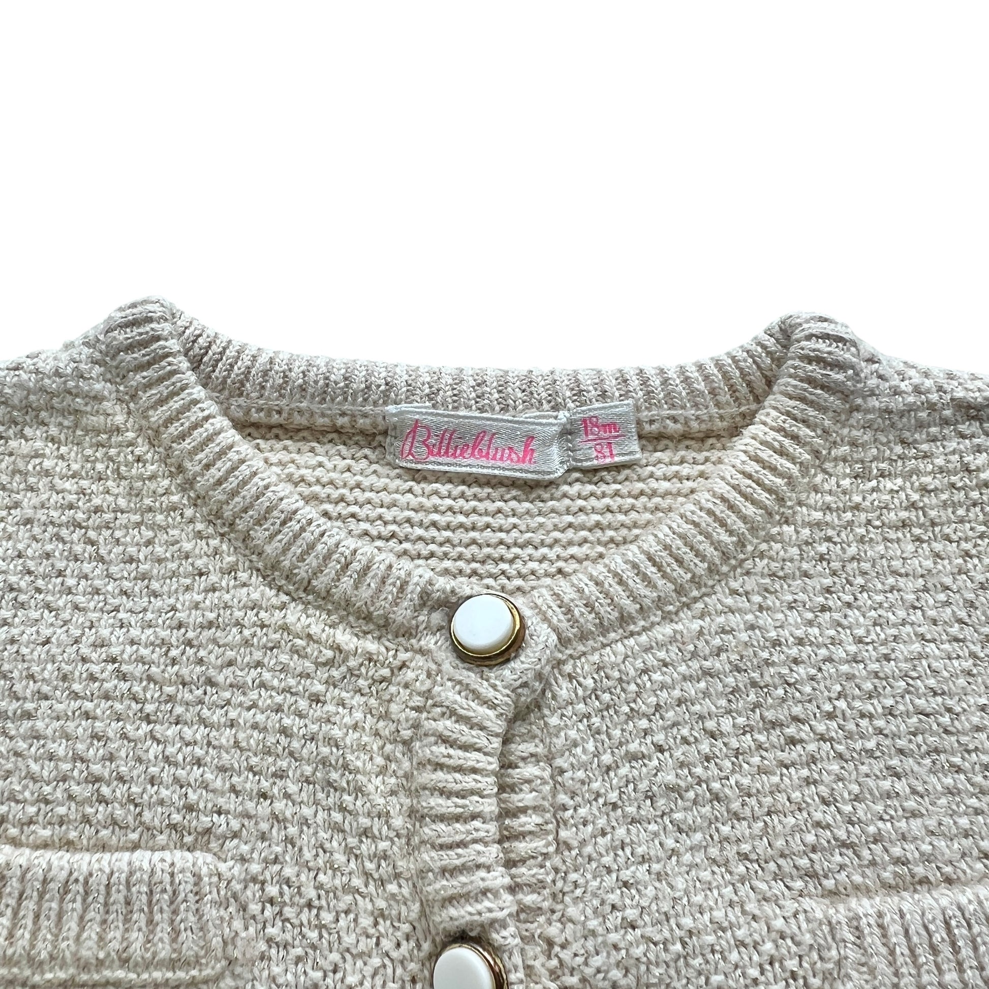 Cardigan Billieblush per bambina di 18 mesi, in stile francese elegante. Realizzato in filato beige arricchito da delicati fili dorati per un effetto luminoso e raffinato. Chiusura con bottoni bianchi e oro che aggiungono un tocco prezioso. Perfetto per giornate speciali con un look romantico e chic.