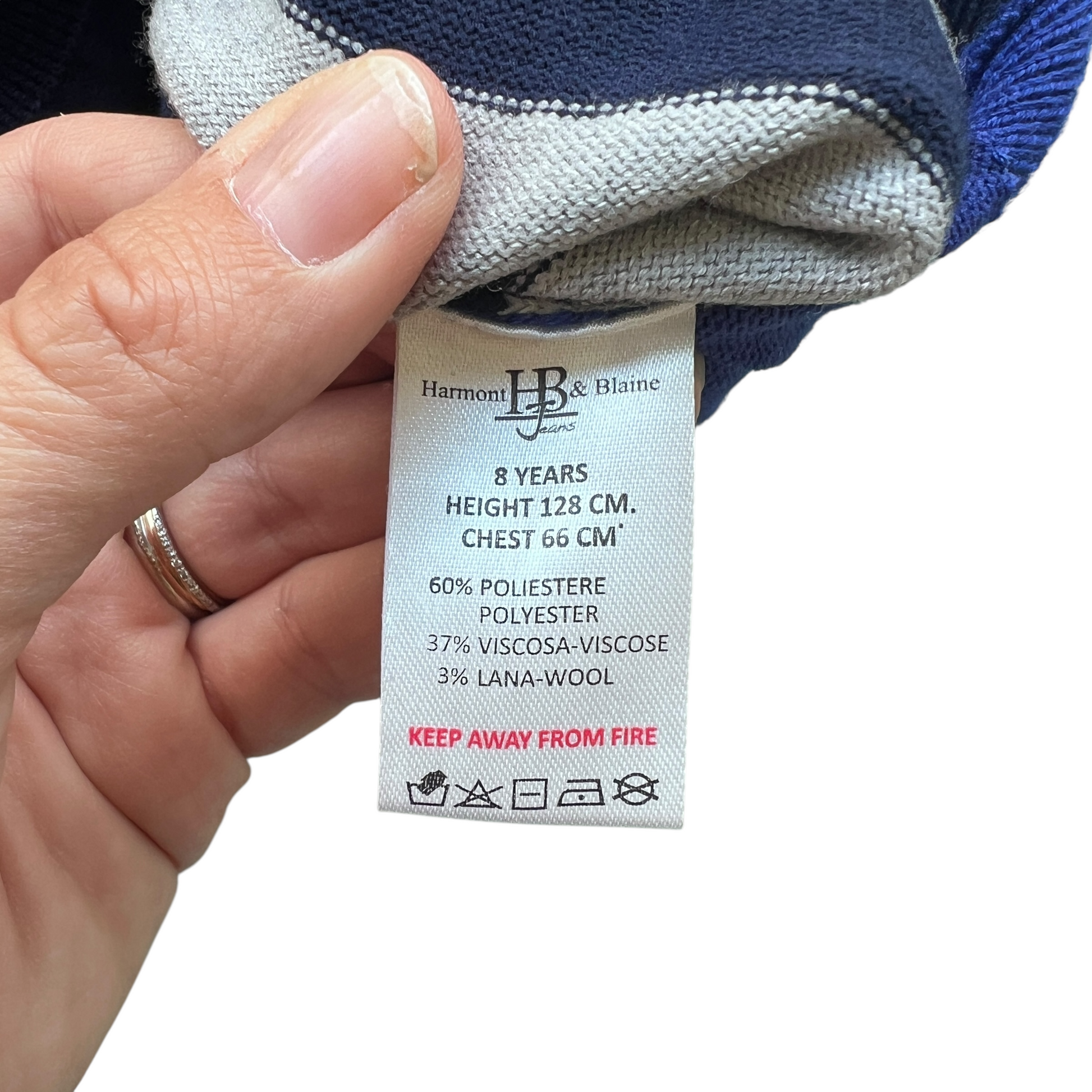 Cardigan Harmont&Blaine per bambino di 8 anni in morbido mix di lana e viscosa. Design originale: metà anteriore a righe blu e grigio, l’altra metà blu tinta unita, con schiena in vivace blu cina. Un capo dal look moderno e dinamico, perfetto per aggiungere stile ai look quotidiani.