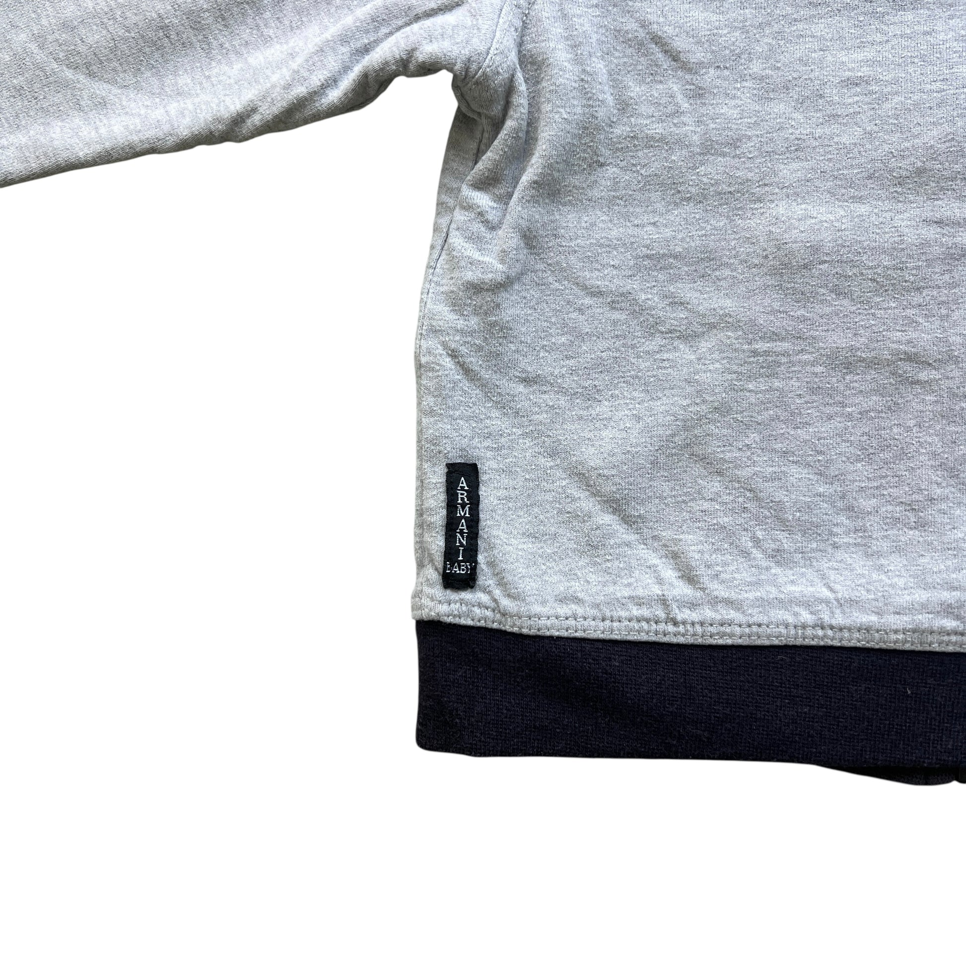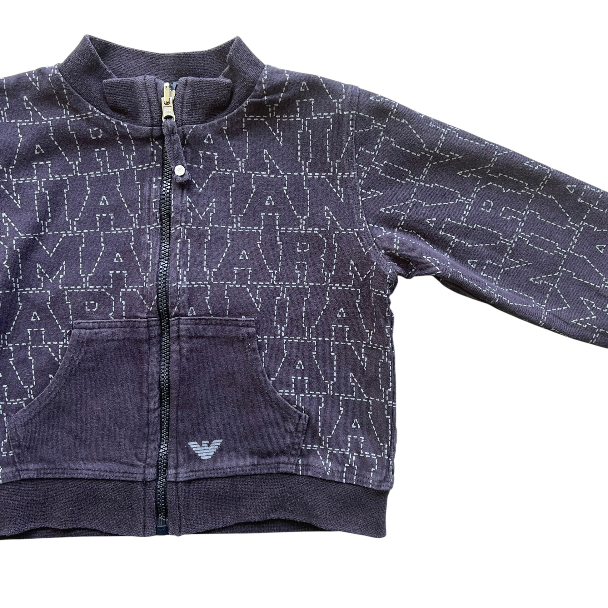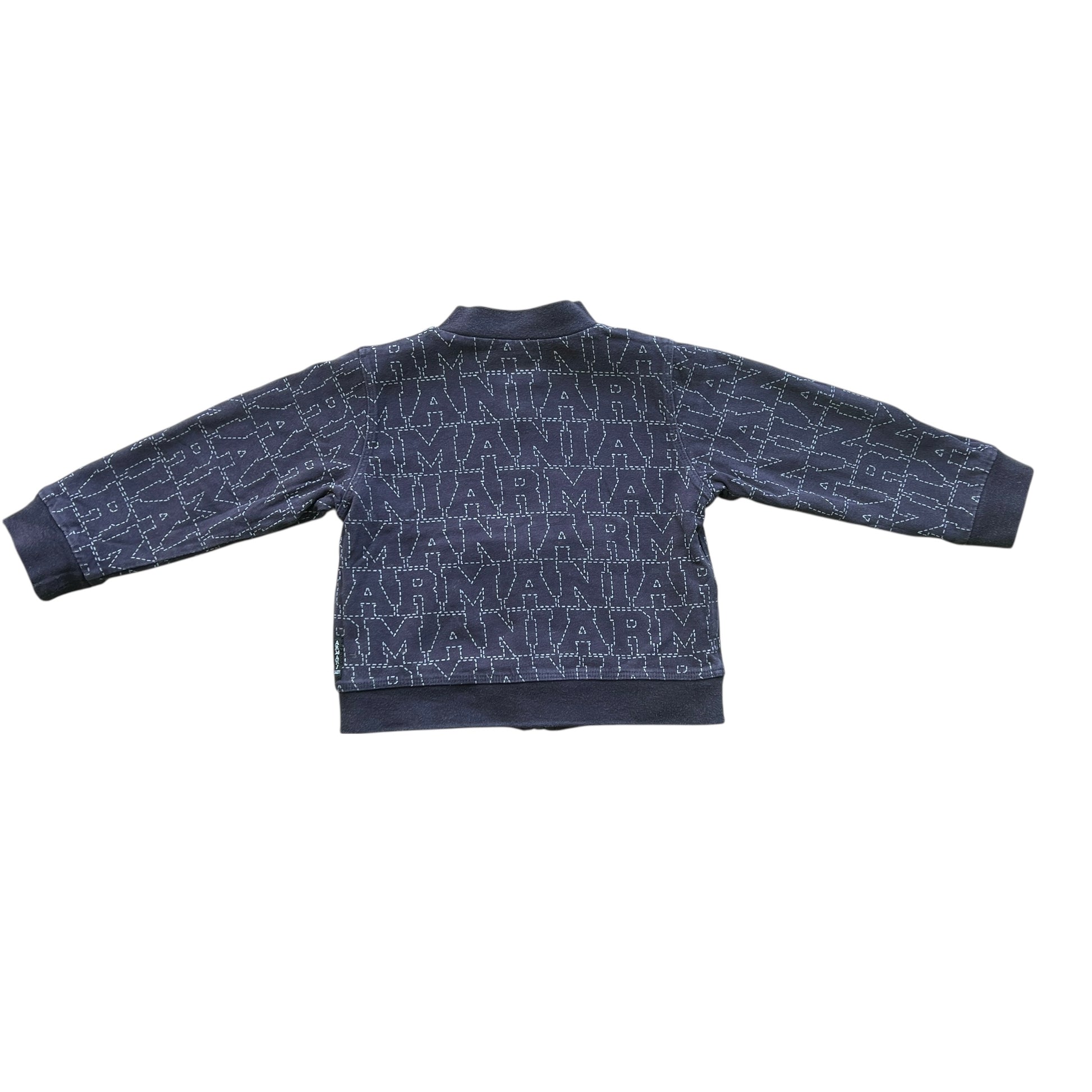 Felpa double face Armani per bambino di 12 mesi, con pratica chiusura full zip e collo dritto. Un lato in grigio con tasche frontali per un look sobrio e versatile, l’altro in blu con scritte all over per uno stile più dinamico e moderno. Due look in uno, comoda e raffinata.