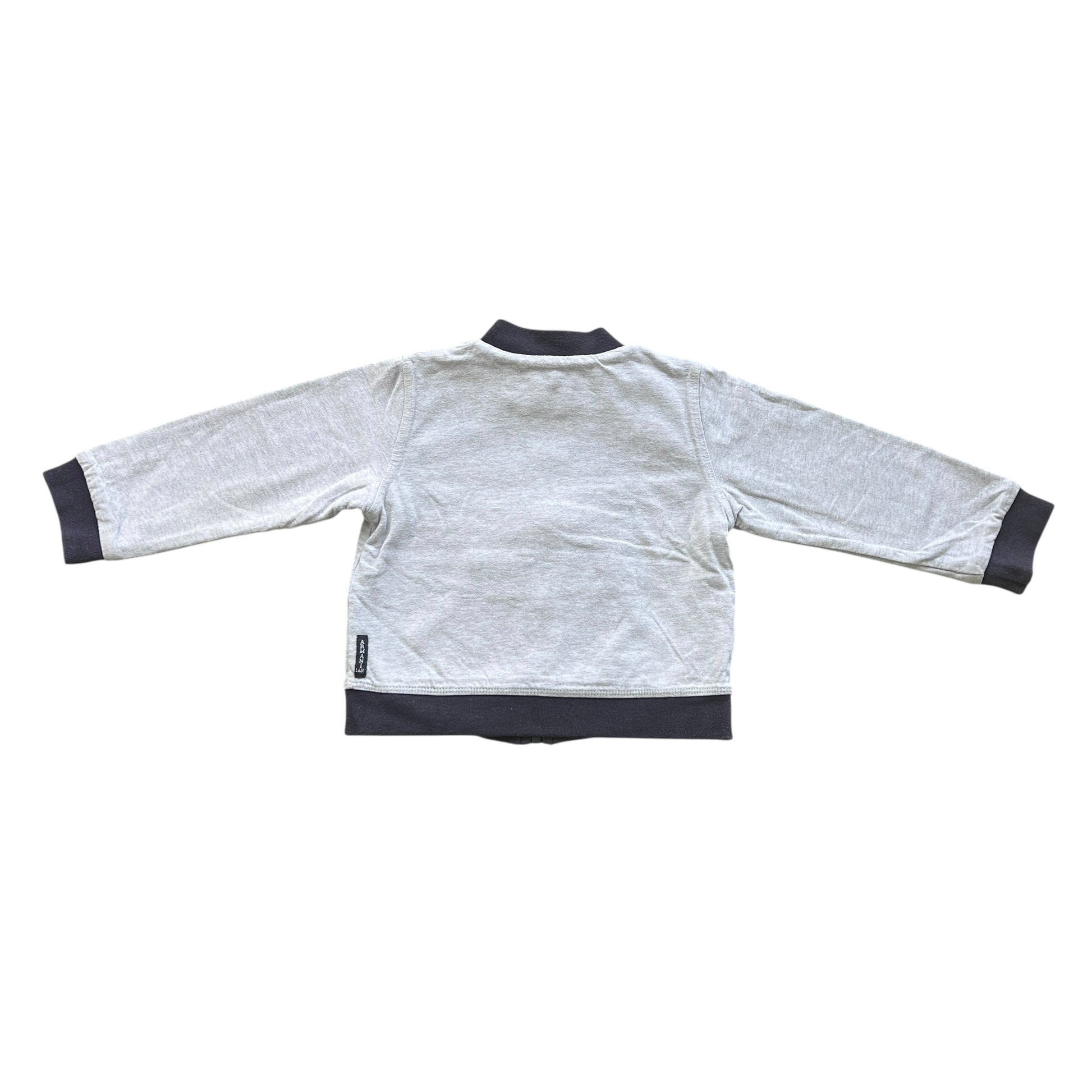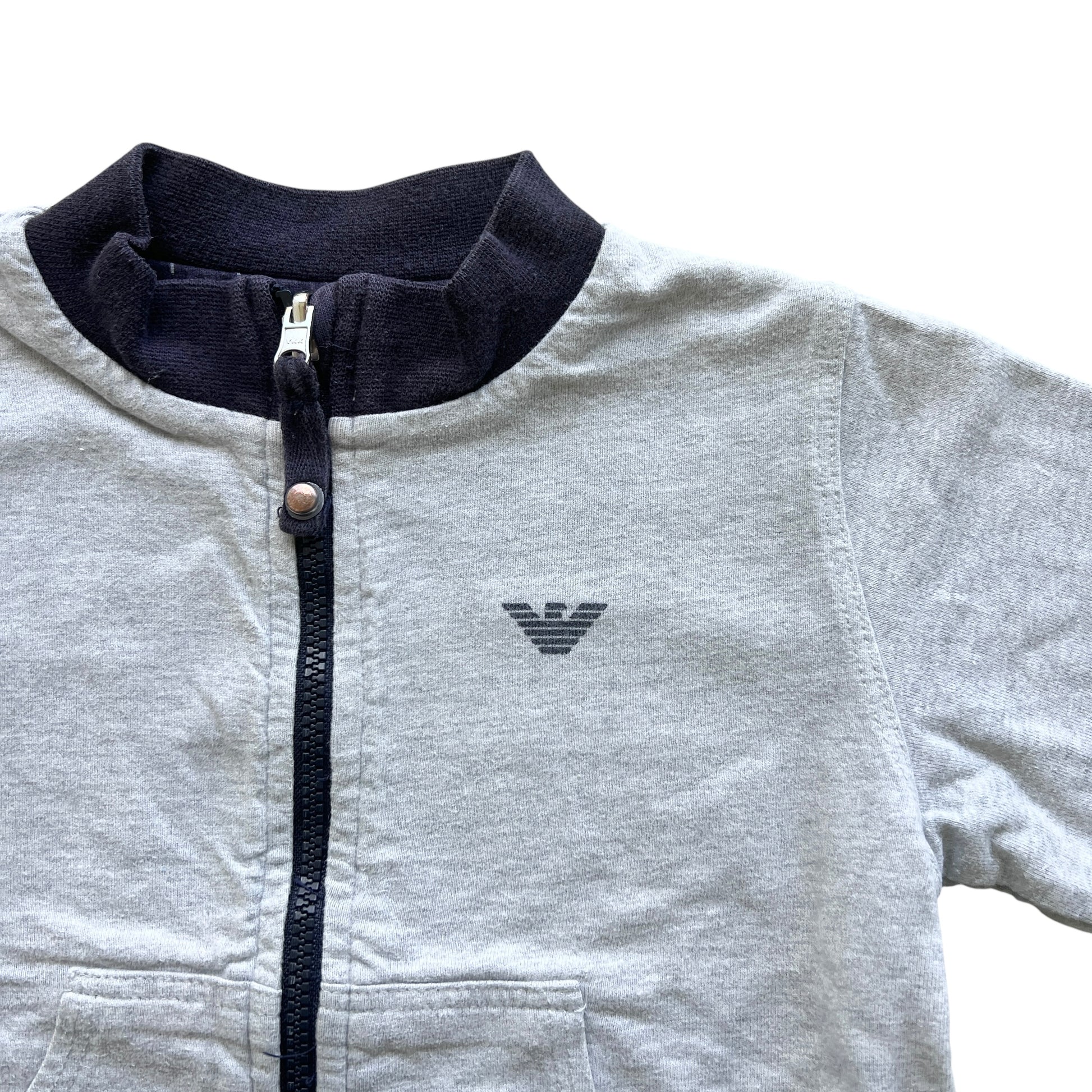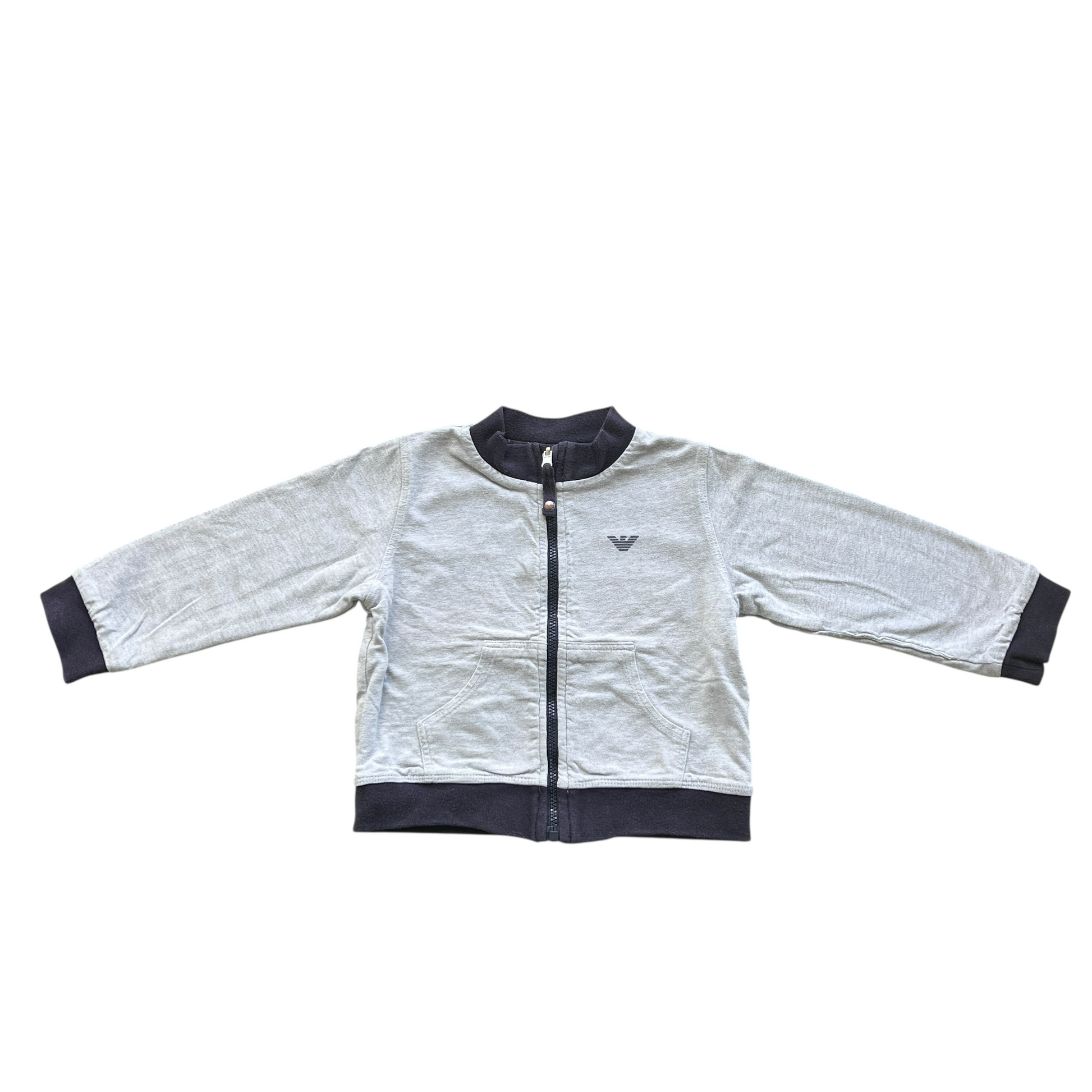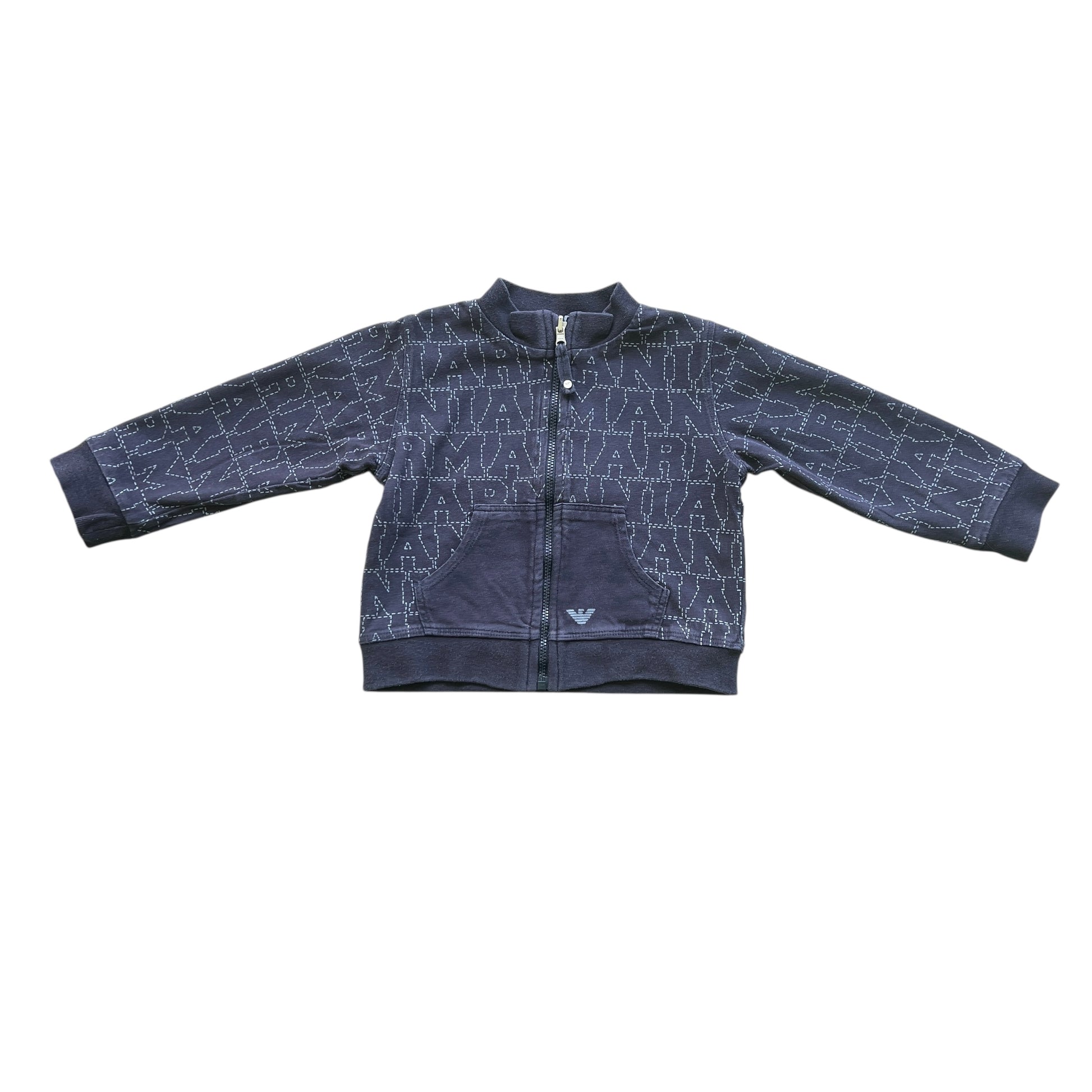 Felpa double face Armani per bambino di 12 mesi, con pratica chiusura full zip e collo dritto. Un lato in grigio con tasche frontali per un look sobrio e versatile, l’altro in blu con scritte all over per uno stile più dinamico e moderno. Due look in uno, comoda e raffinata.
