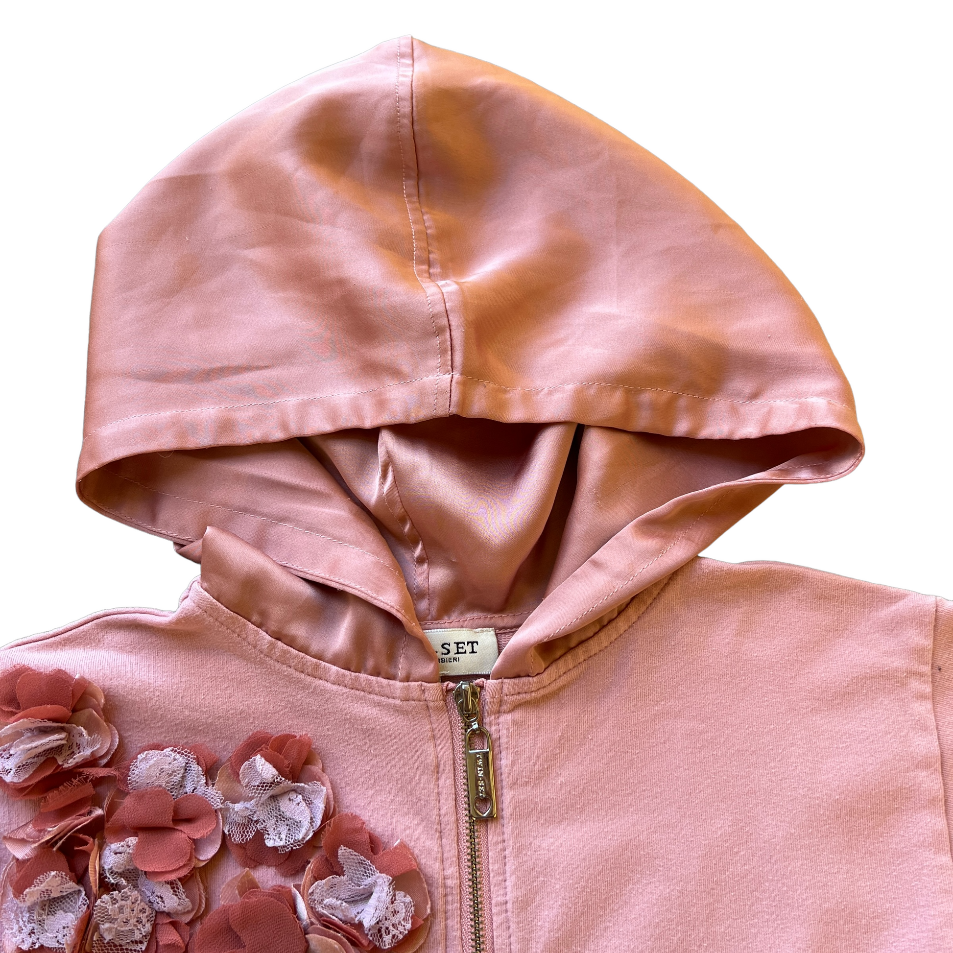 Felpa rosa full zip Twin Set per bambina, taglia 8 anni, arricchita da delicati fiori applicati. Il cappuccio in raso aggiunge un tocco di eleganza e femminilità a questo capo, ideale per un look casual ma raffinato. Perfetta per le giornate più fresche con un tocco di stile.