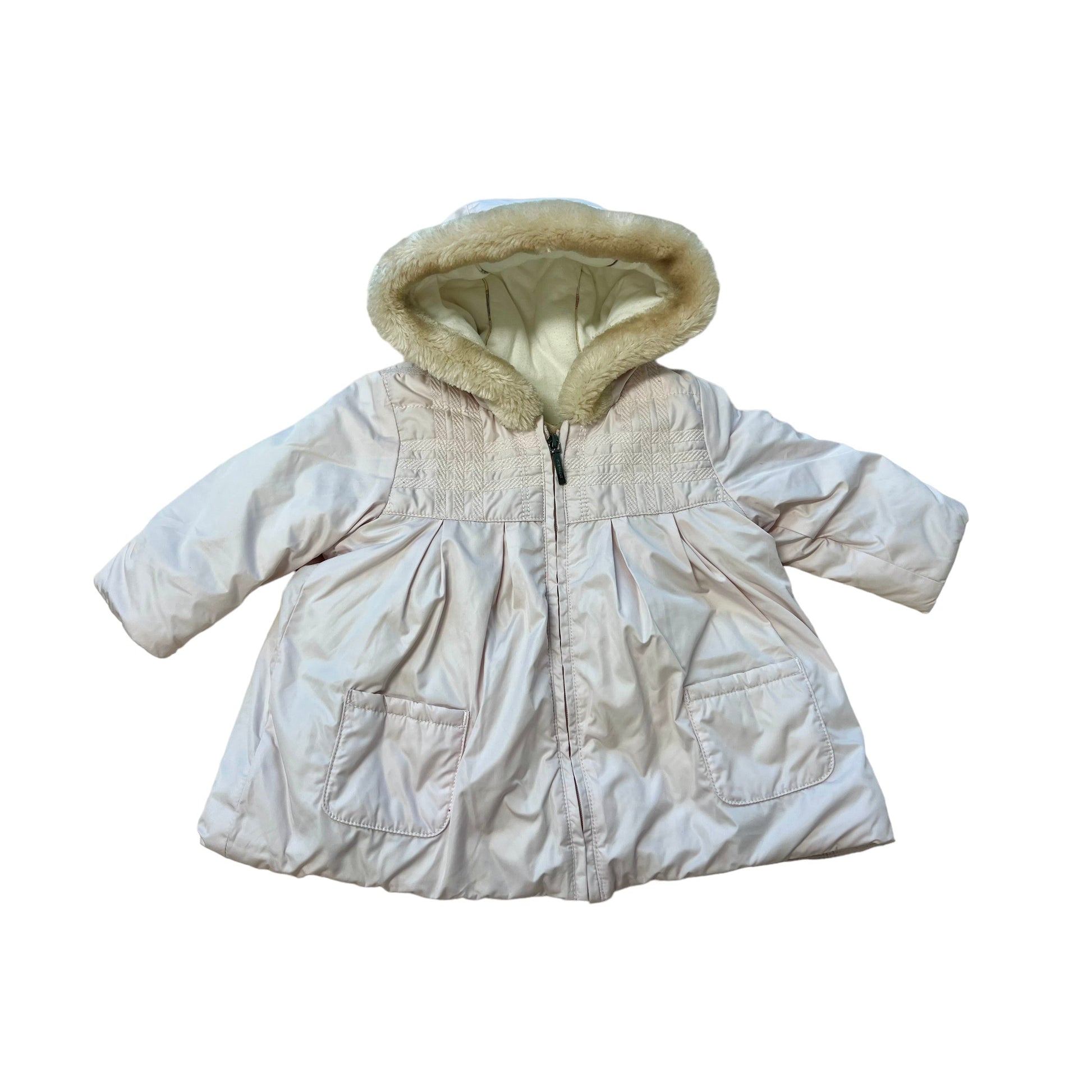 La giacca invernale Burberry rosa pallido è un capo di eleganza e comfort. Con ricami raffinati e cappuccio bordato in peluche, offre un tocco di lusso. I dettagli interni in tartan e la fodera in cotone la rendono irresistibile. Realizzata con materiali di alta qualità, è perfetta anche per le giornate più fredde. Taglia 6 mesi abbondante