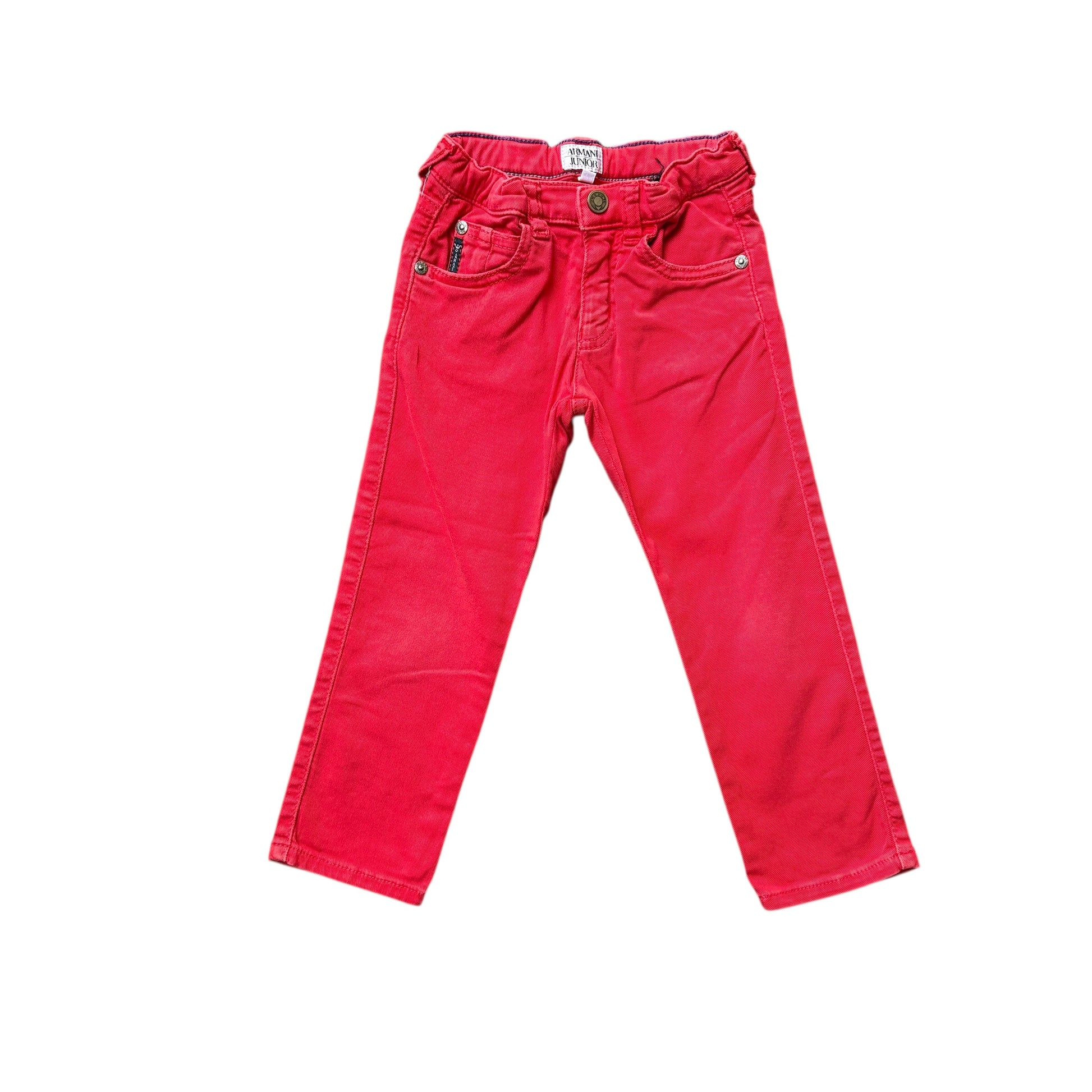Jeans rossi Armani Junior, taglia 3 anni. Modello a cinque tasche con chiusura frontale e vita regolabile, dal taglio dritto e pulito. Colore vivace che dona carattere al look, mantenendo uno stile curato. Capo usato in ottime condizioni, disponibile e pronto per l’invio.