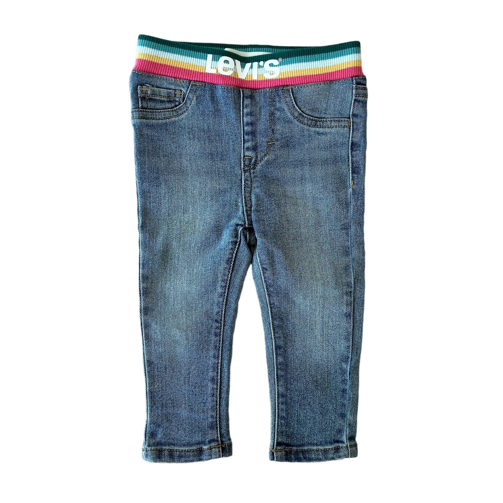 Jeans modello Skinny pull on elasticizzati di Levi's con elastico in vita dai colori femminili. Modello 5 tasche con le due frontali finte, mentre reali le due sul retro. Taglia 9 mesi