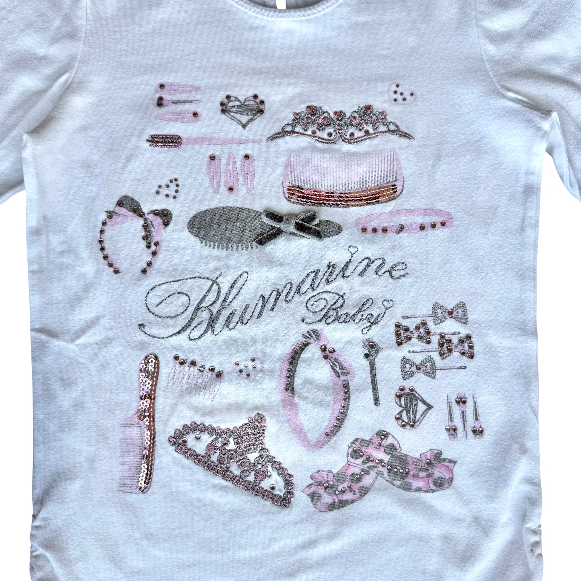Innamorati dello stile romantico e prezioso di Blumarine Baby. Questa maglia a manica lunga, realizzata in cotone morbido di un bianco puro, è un vero gioiello per la tua bambina. Il fronte è impreziosito da una stampa elegante che raffigura accessori di lusso e dettagli "beauty", resa unica dall'applicazione di tantissimi strass brillanti e punti luce metallizzati.