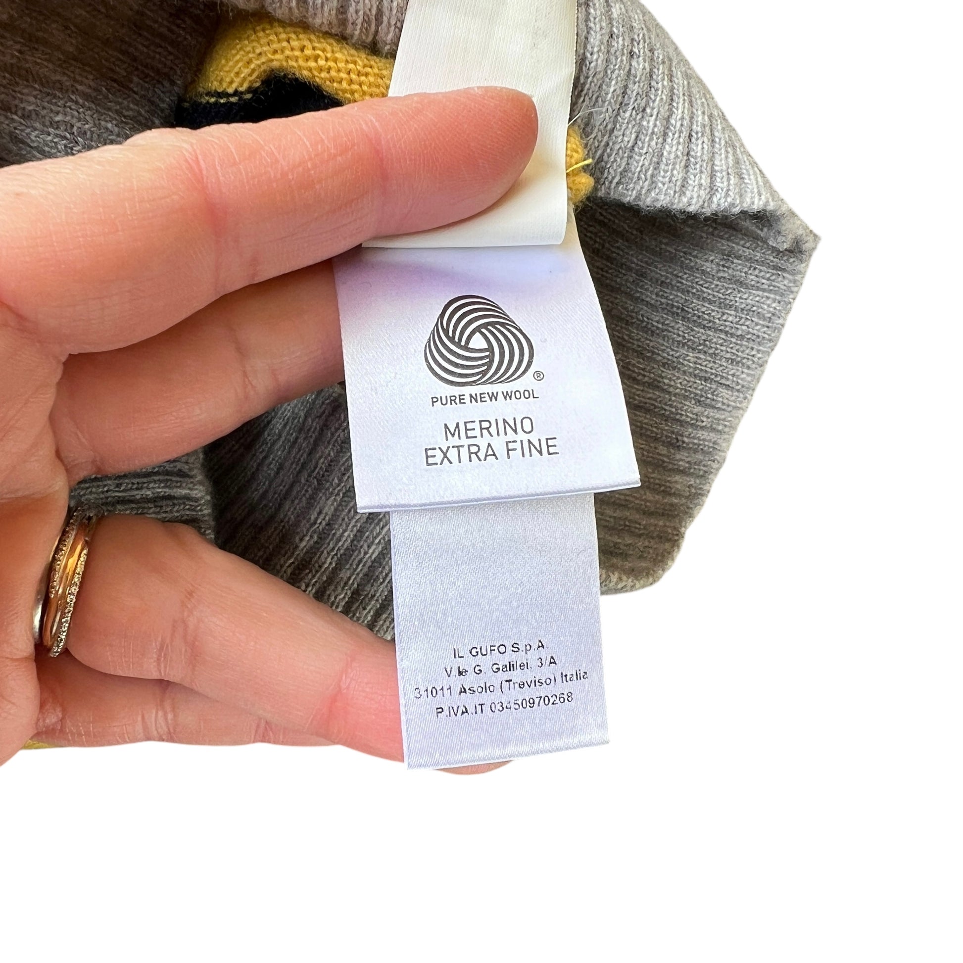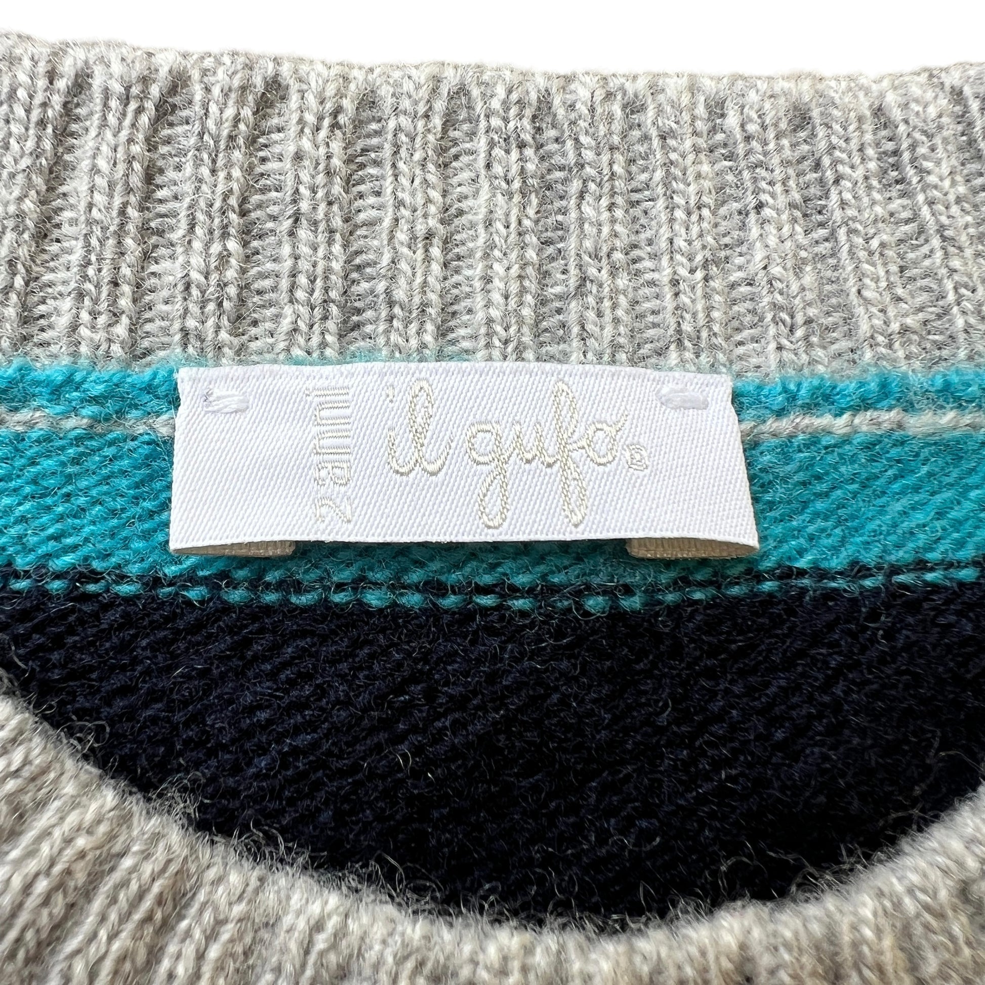 Maglione 100% lana merino firmato Il Gufo, a righe colorate, per bambino di 2 anni, unisce calore e stile. Perfetto per le giornate fredde, è morbido e comodo, ideale per un look simpatico ma ricercato.