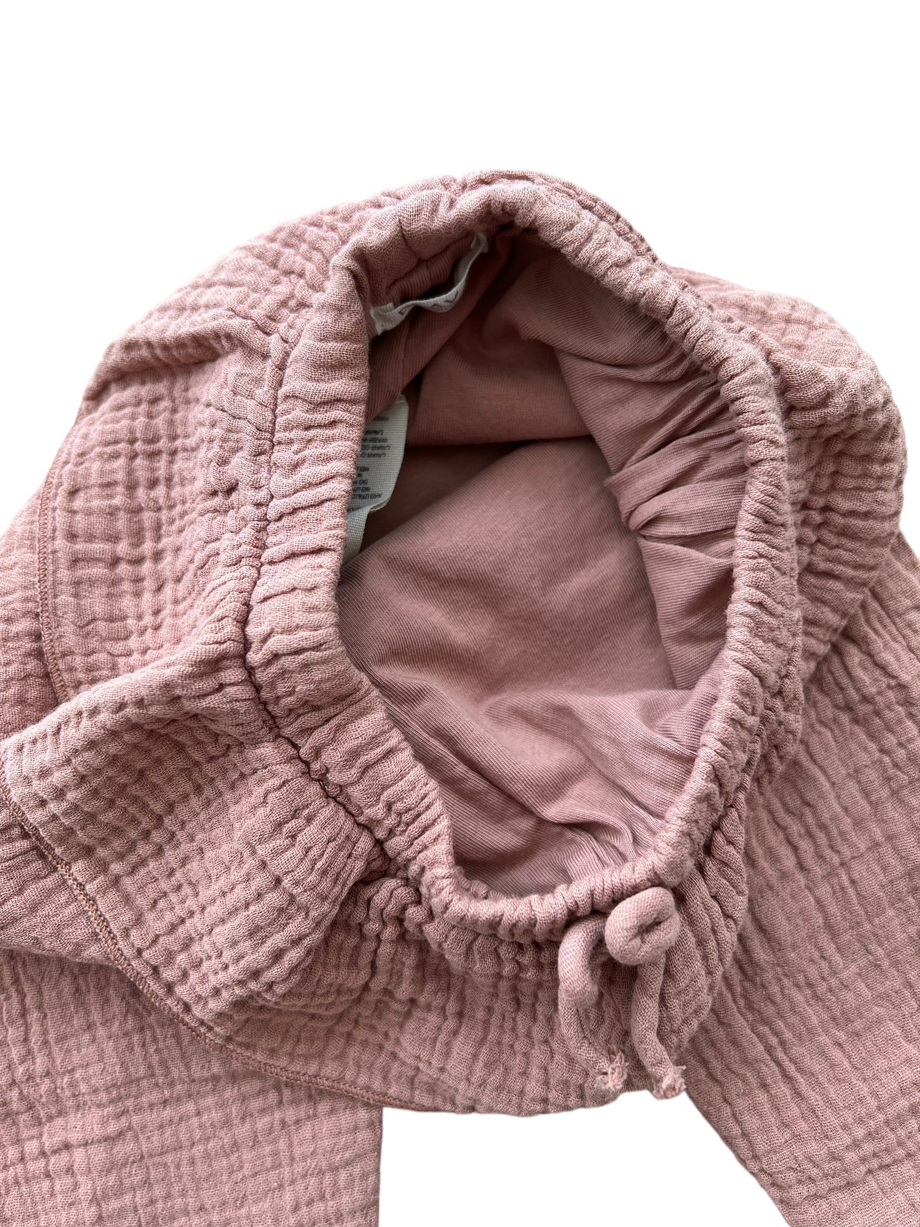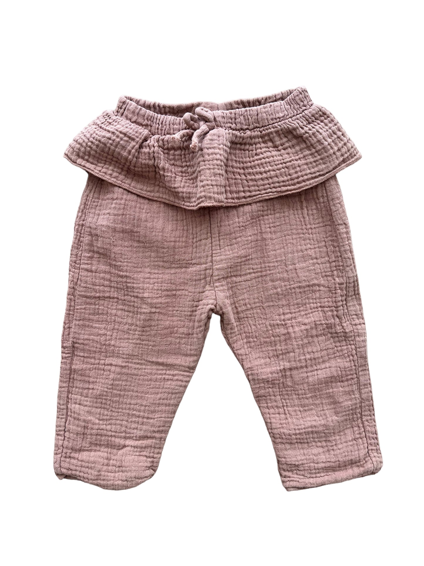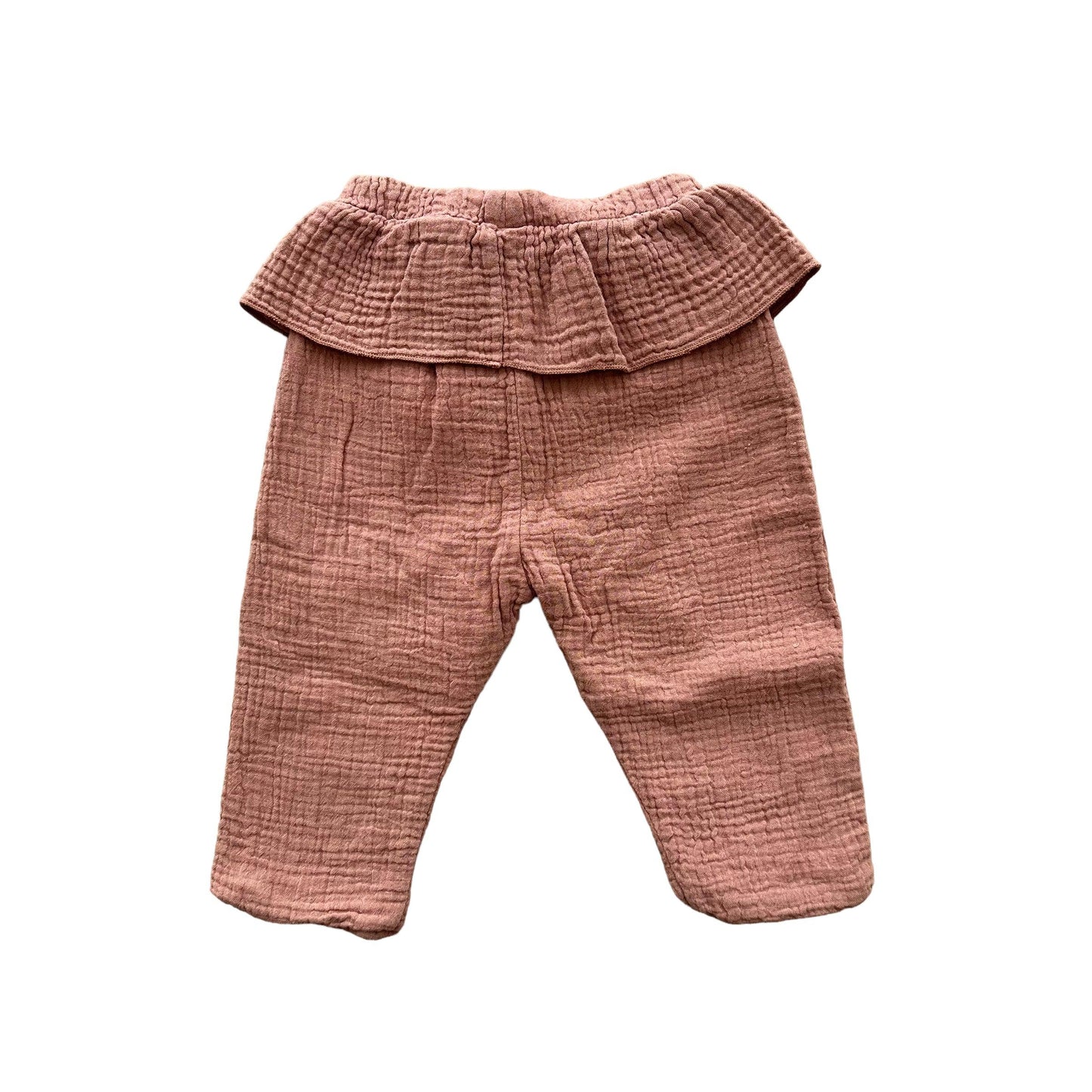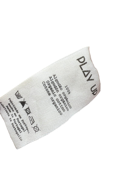 Pantaloni di Play Up realizzati in mussola e cotone organico, modello con cintura elasticizzata, cordoncino decorativo e balza in vita per la massima femminilità. Le fibre organiche utilizzate in questo capo sono certificate GOTS (Global Organic Textile Standard). Tutte le materie prime utilizzate in questo capo sono certificate Standard 100 da OEKO-TEX, Classe I e sono state testate per verificare la presenza di sostanze nocive per la pelle dei bambini. Taglia 6 mesi