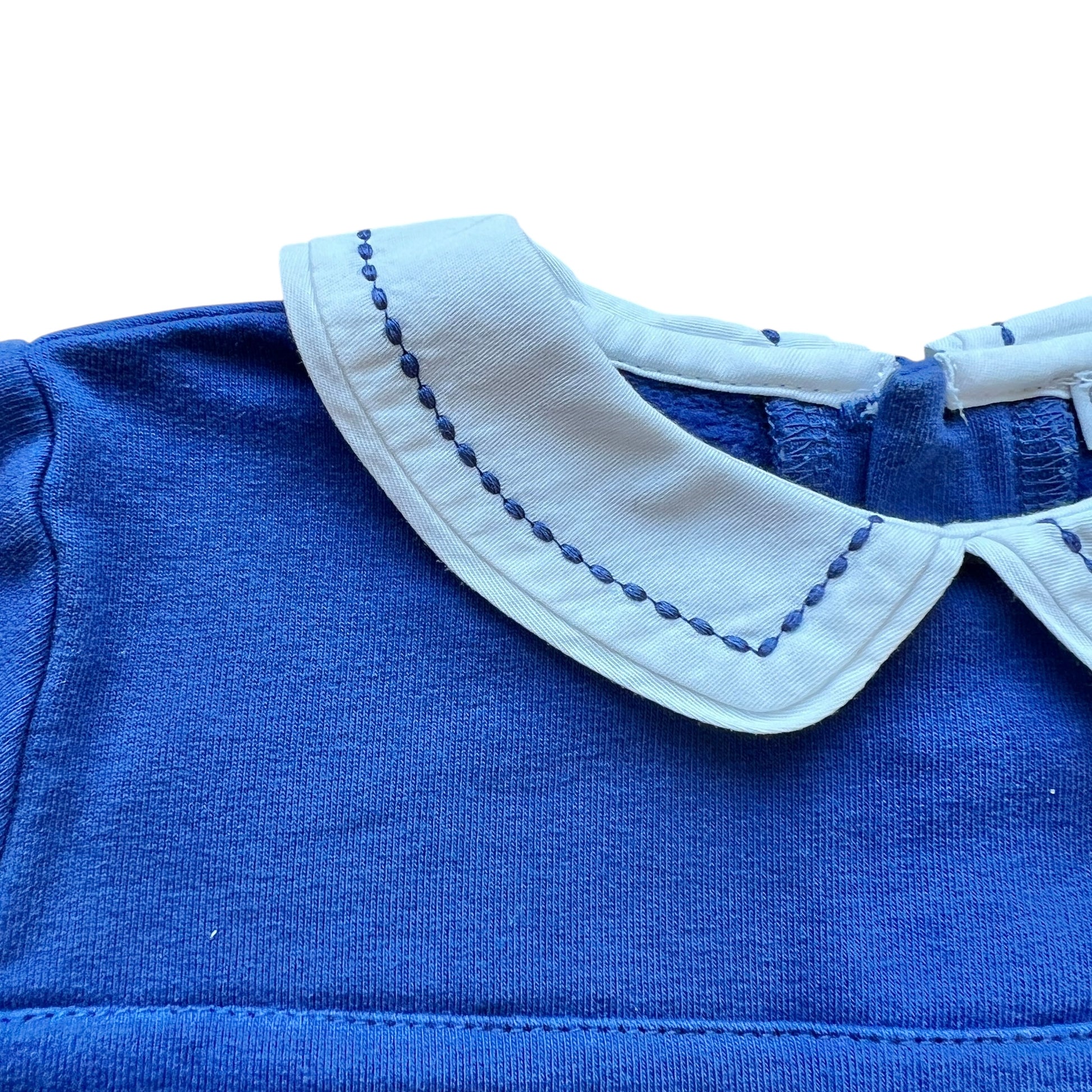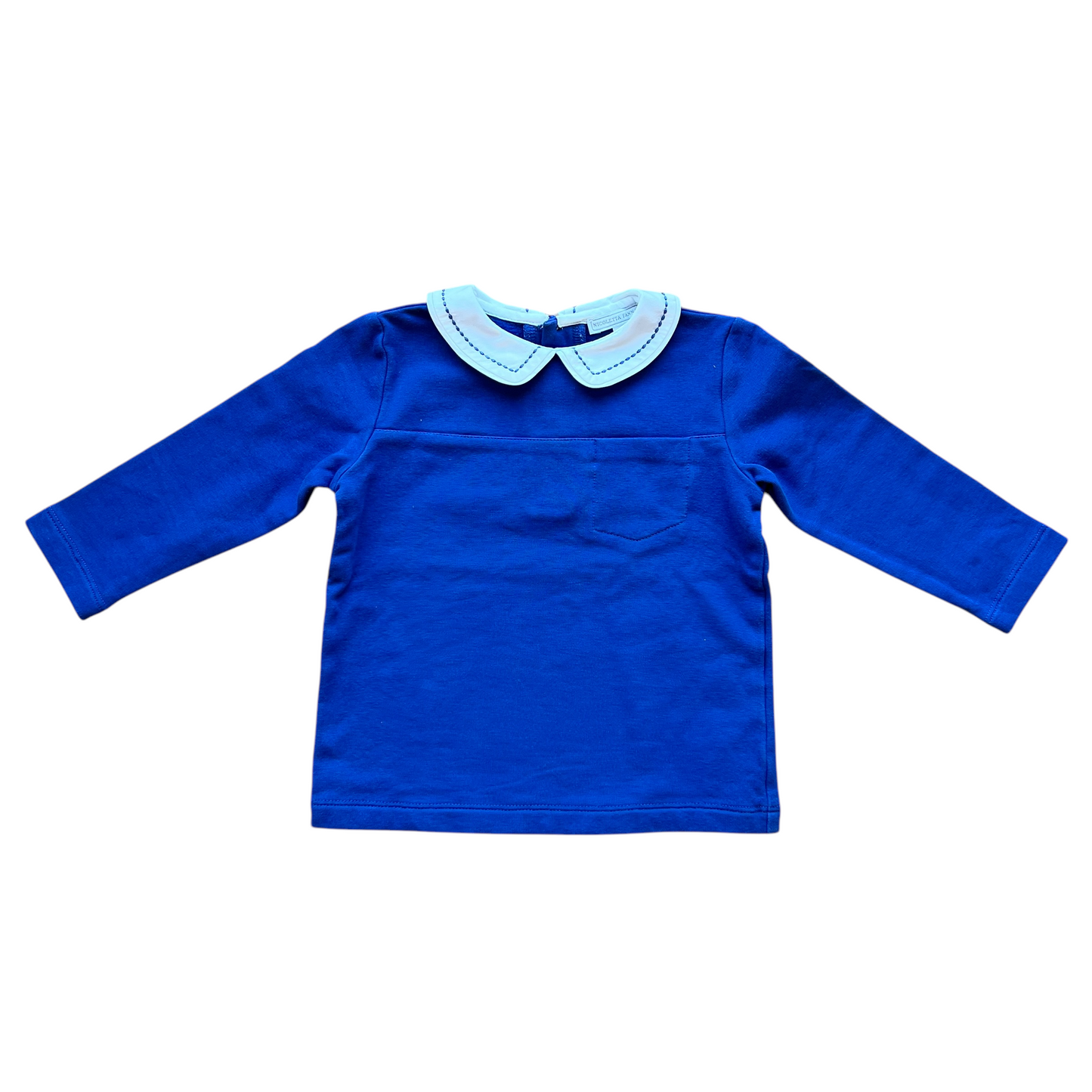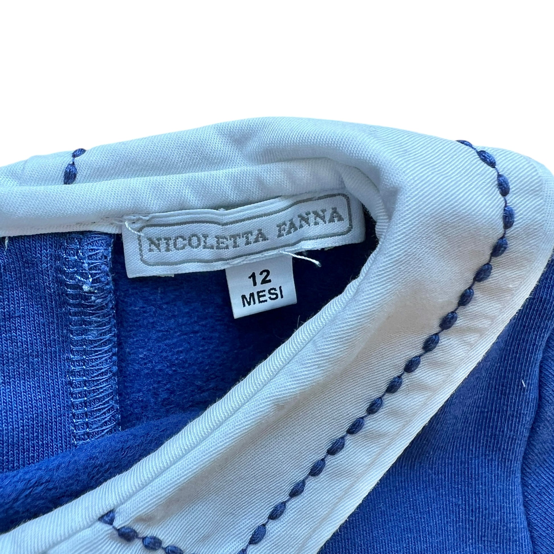 Polo in cotone blu firmata Nicoletta Fanna, perfetta per bambini di 12 mesi. Dotata di taschino e colletto bianco ricamato a contrasto, unisce eleganza e praticità. Morbida e confortevole, è ideale per ogni occasione, donando un tocco raffinato e curato al guardaroba dei più piccoli.