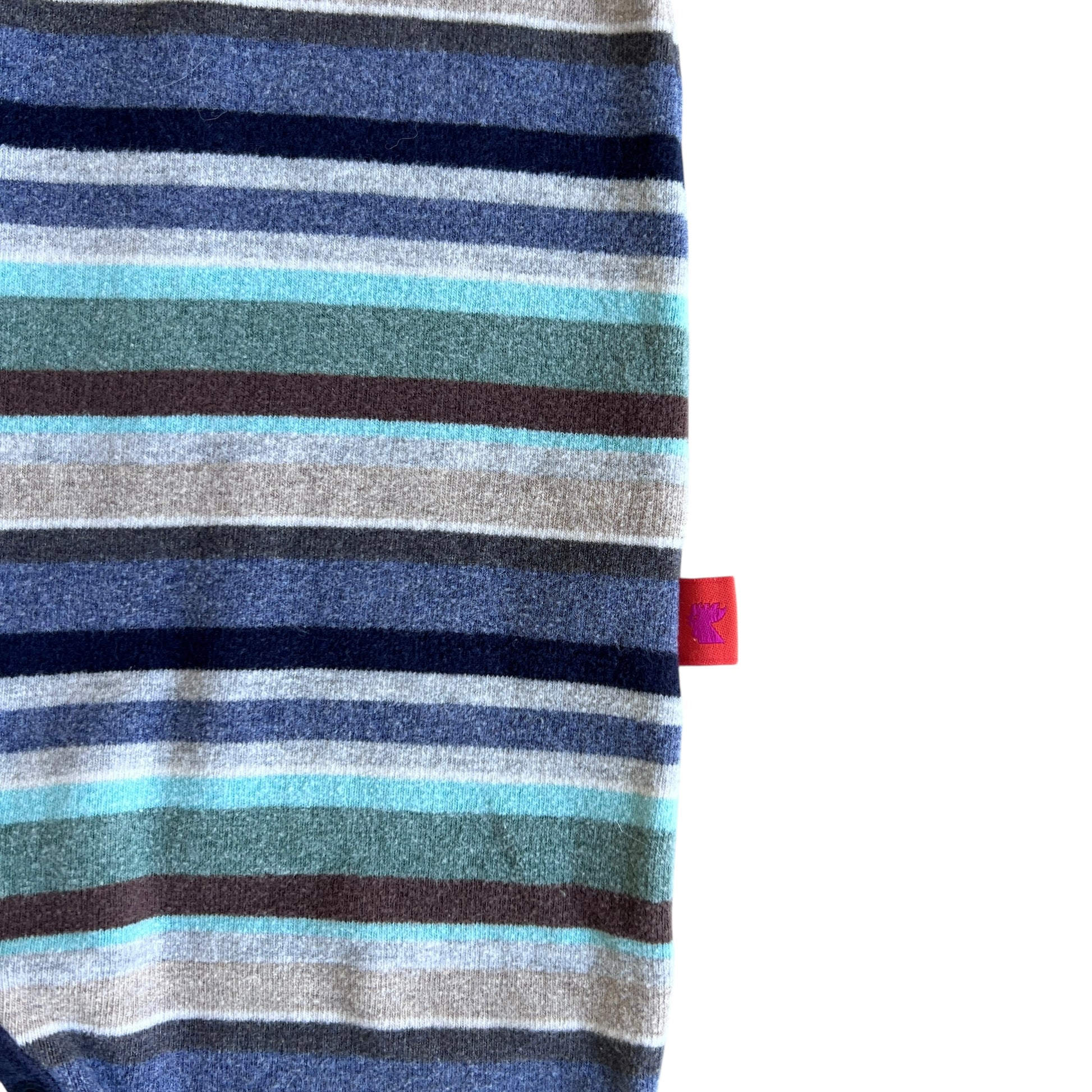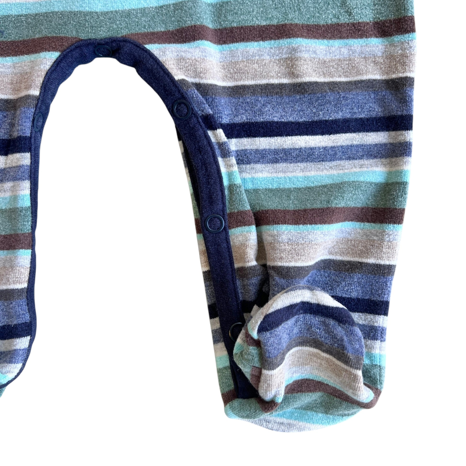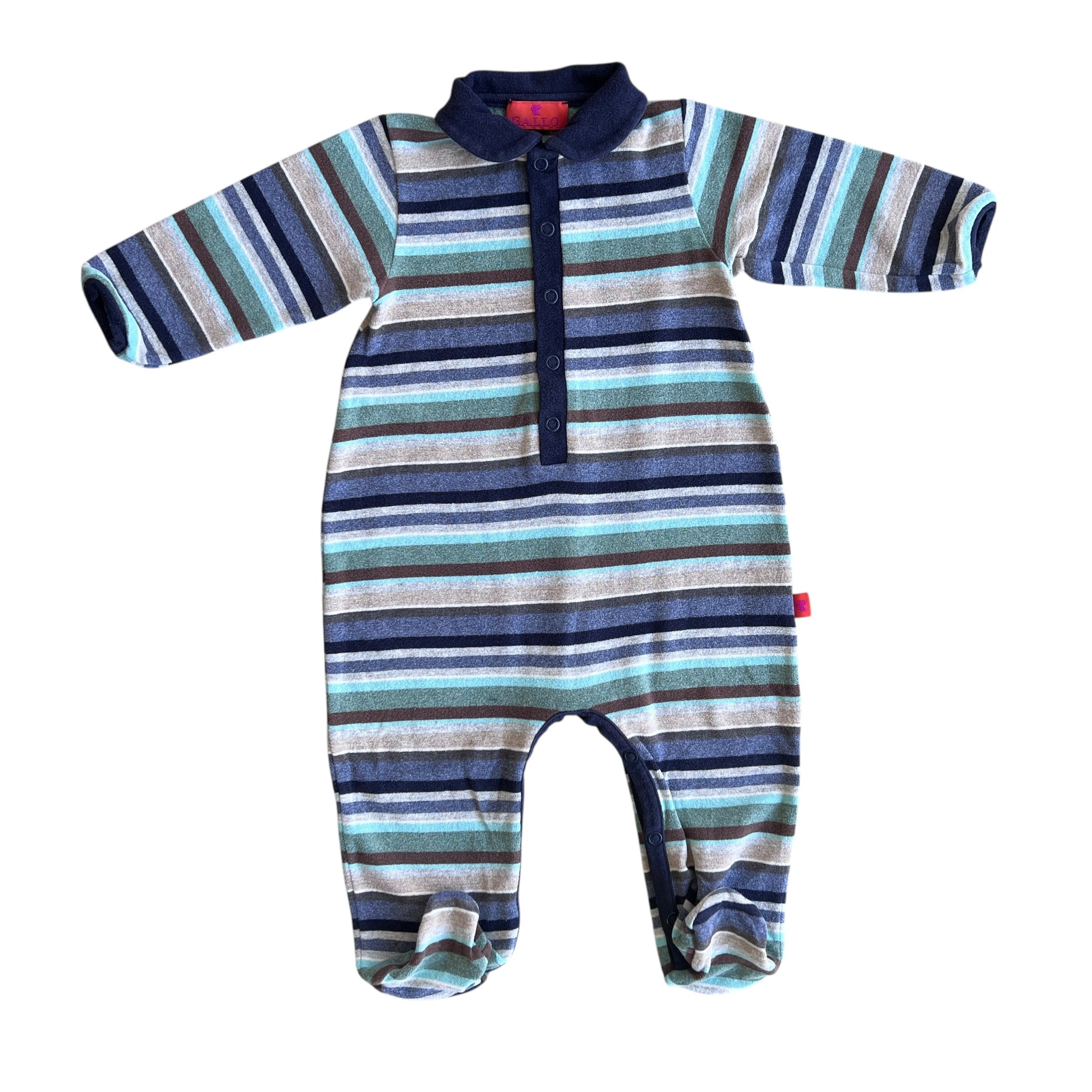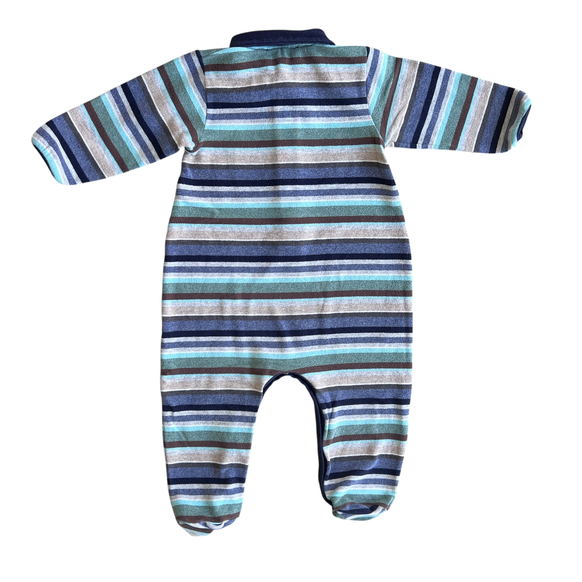 Tutina da neonato con apertura a bottoncini a pressione sul torace e in mezzo alle gambe per facilitare il cambio del bambino. Realizzata in Italia. Perfetta nella mezza stagione per rendere colorato e unico il look dei nostri bebè. Colletto in colore a contrasto. Fantasia a righe multicolor nei toni del blu, beige e verde. Taglia riferita dalla mamma 6 mesi