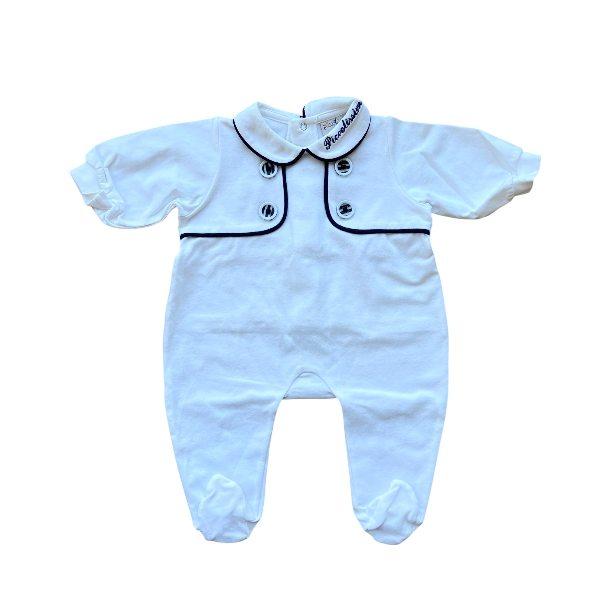 Tutina Piccolissimi di Petit Newborn per neonato di 0 mesi, in morbido cotone elasticizzato bianco con delicato colletto rotondo rifinito con bordi blu a contrasto e bottoni decorativi frontali. Elegante e confortevole, perfetta per i primi giorni, unendo funzionalità e stile classico e delicato